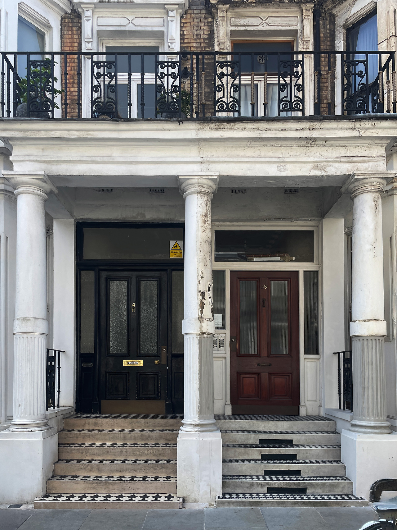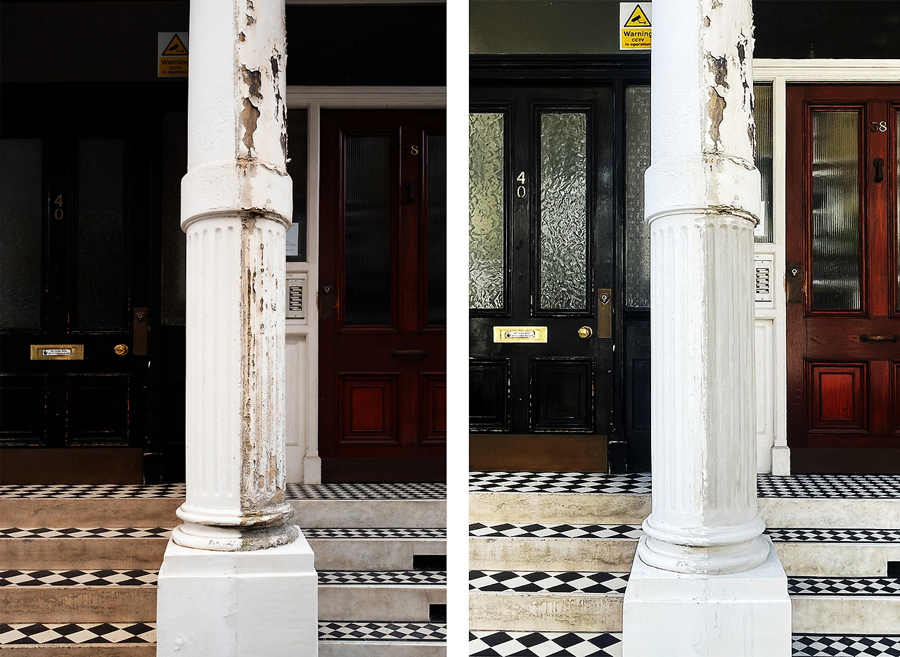 처음 이 '당연하고도 이상한' 부분을 목격한 건 런던에서 내가 처음 구해서 살던 플랫 입구 기둥이 이렇게 생겨서였다. 뭔가 살짝 불편하지 않은가? 사진 중심선을 기준으로 왼쪽이 내가 살던 플랫이었고 오른쪽은 이웃집이었다. 이 기둥을 보면 마치 아수라백작 얼굴같다. 누가 봐도 오른쪽 집 주인보다 왼쪽 집의 주인이 이 집에 대해 더 관심있어보인다. 처음에는 별 관심이 없었는데 집을 드나들 때마다 보면서 도대체 저 기둥은 어쩌다가 저렇게 되었나 궁금해졌다.