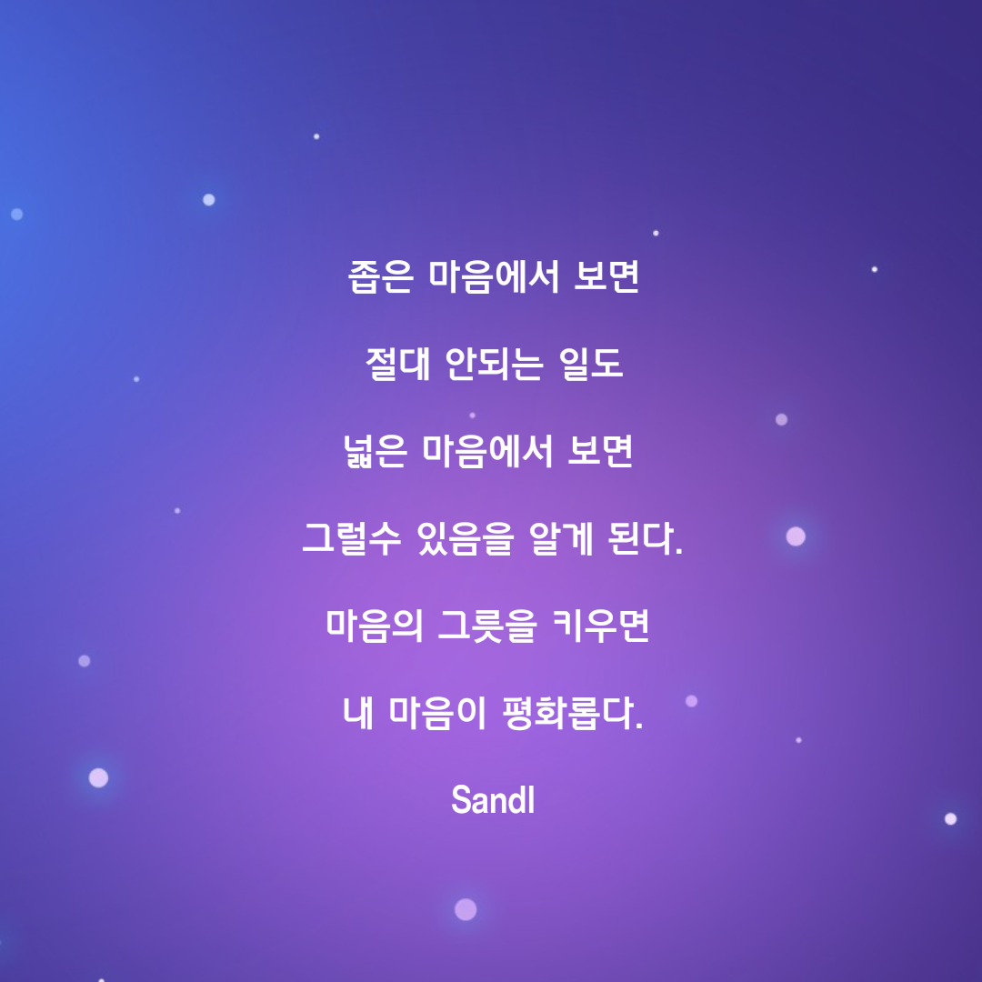 마음이 좁다는 것은 내가 가진 고정 관념 안에서 대상을 인식할 때, 또는 내 기준에서 내 이익만 생각할 때 일어나는 마음이라고 할 수 있다. 반면 마음이 넓다는 것은 나 뿐만 아니라 상대의 입장까지도 생각해서 나도 좋고 너도 좋은 모두의 이익을 생각할때, 내가 가진 고정관념을 버리고 이래야된다 저래야된다는 관점이 아니라이럴수도 있고 저럴수도 있다는 열린 생각을 가지고 있을때 일어날 수 있는 마음이다.