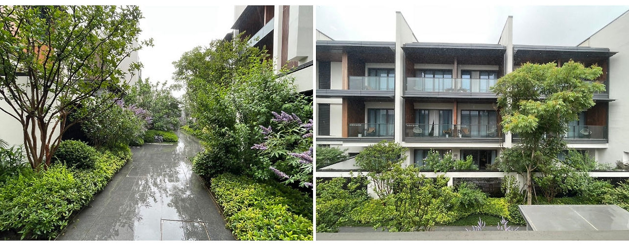 호텔 안은 예뻐요. 마치 가정집 마당을 걷는 기분, 예쁜 보라색 꽃이 피어서 내리는 비에 같이 떨어지고 있어요.
