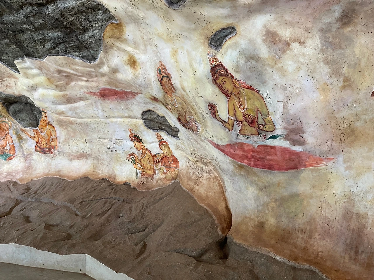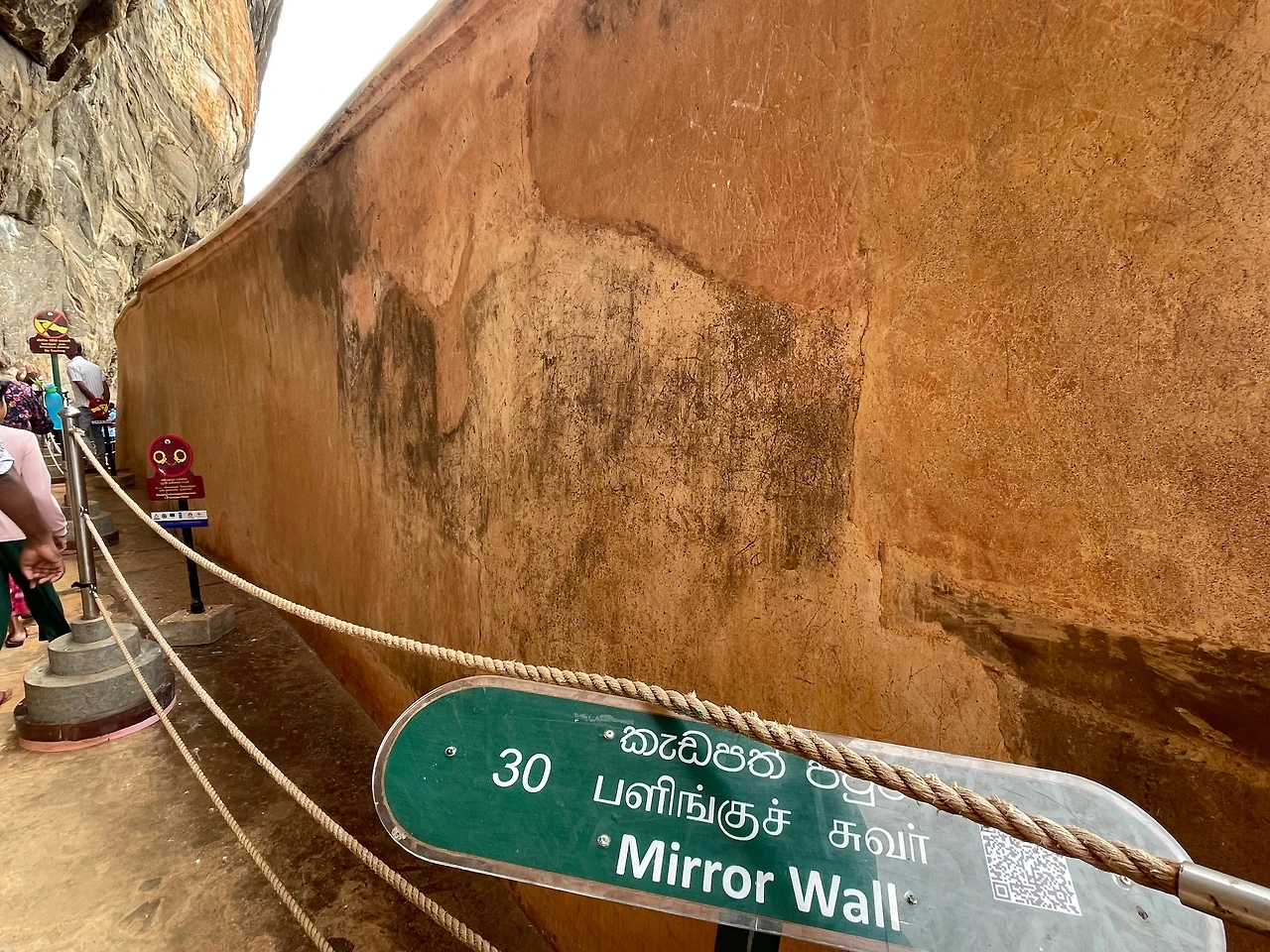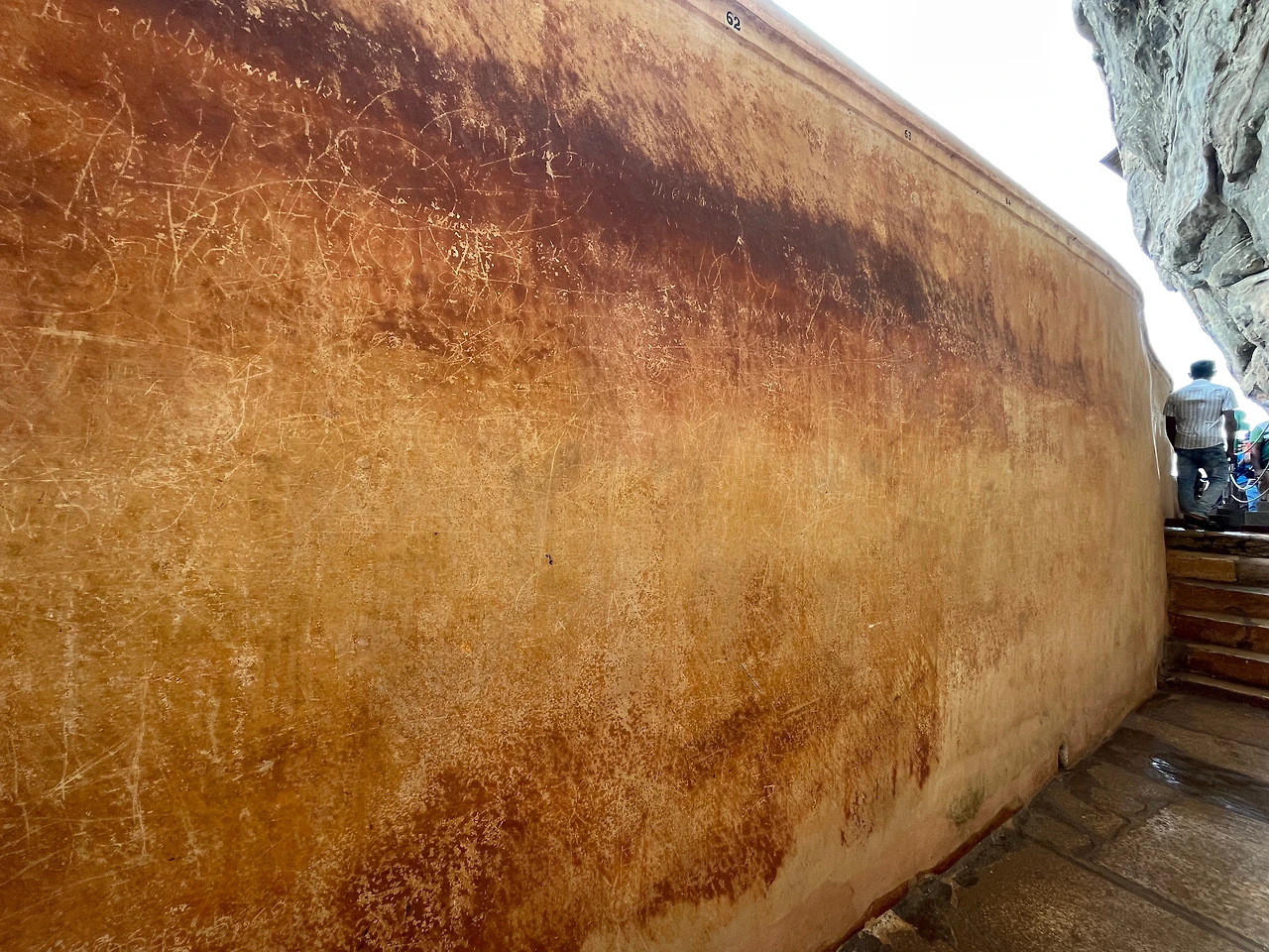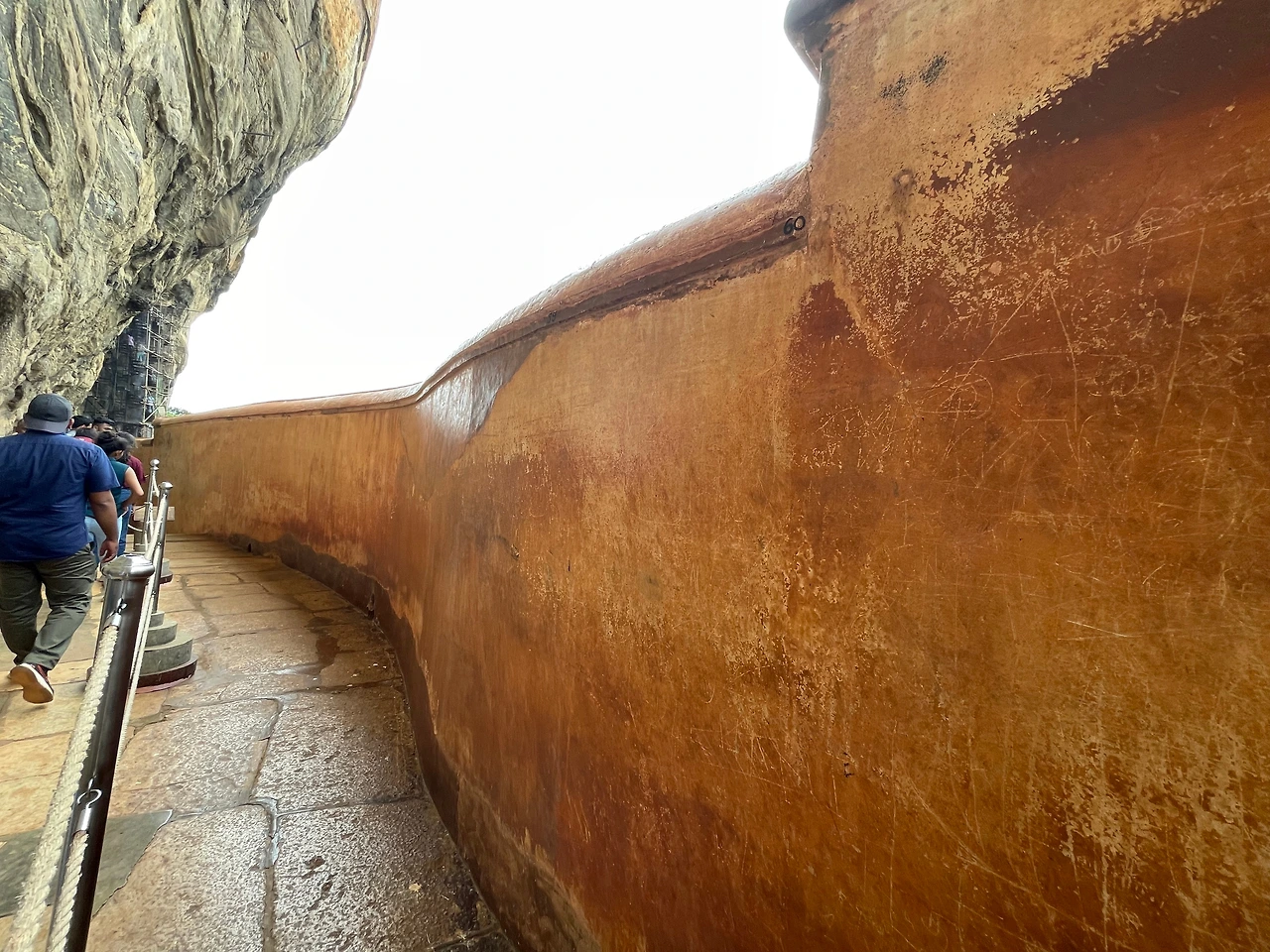 내려오는 길에 시기리야의 낙서 Sigiriya Graffiti로 불리는 거울의 벽과 시기리야 레이디 Sigiriya lady로 불리는 프레스코 벽화를 봤어요. 벽돌로 만들었다는 거울의 벽에 남은 낙서가 지금은 소중한 연구 자료예요. 당시 문학을 추정하는 자료네요. 벽화를 보려면 뱅글뱅글 철제계단을 올라가야 해요.