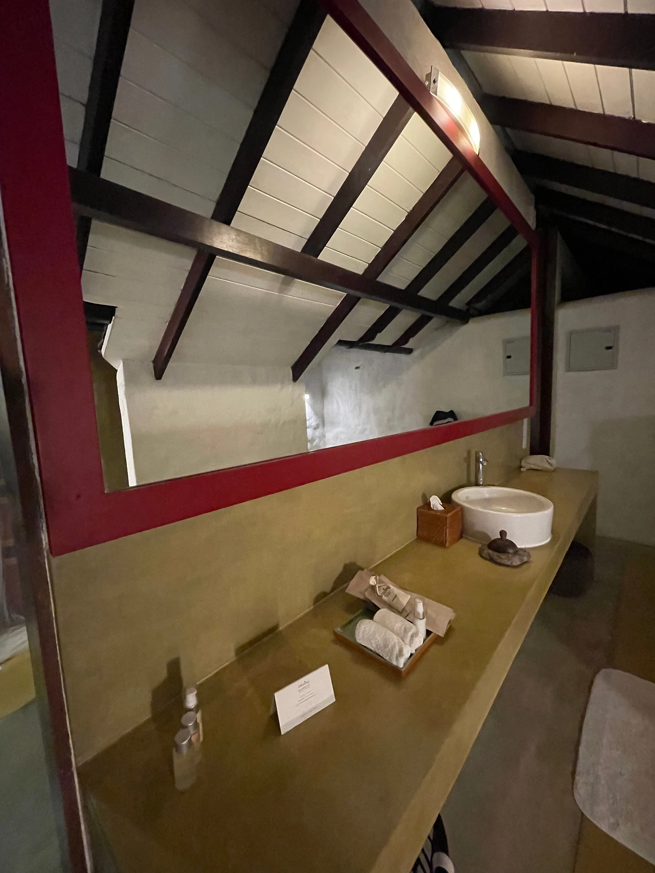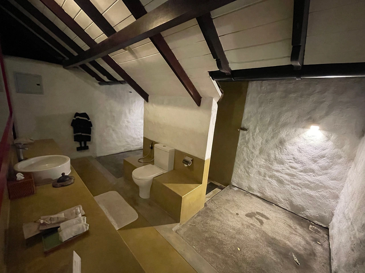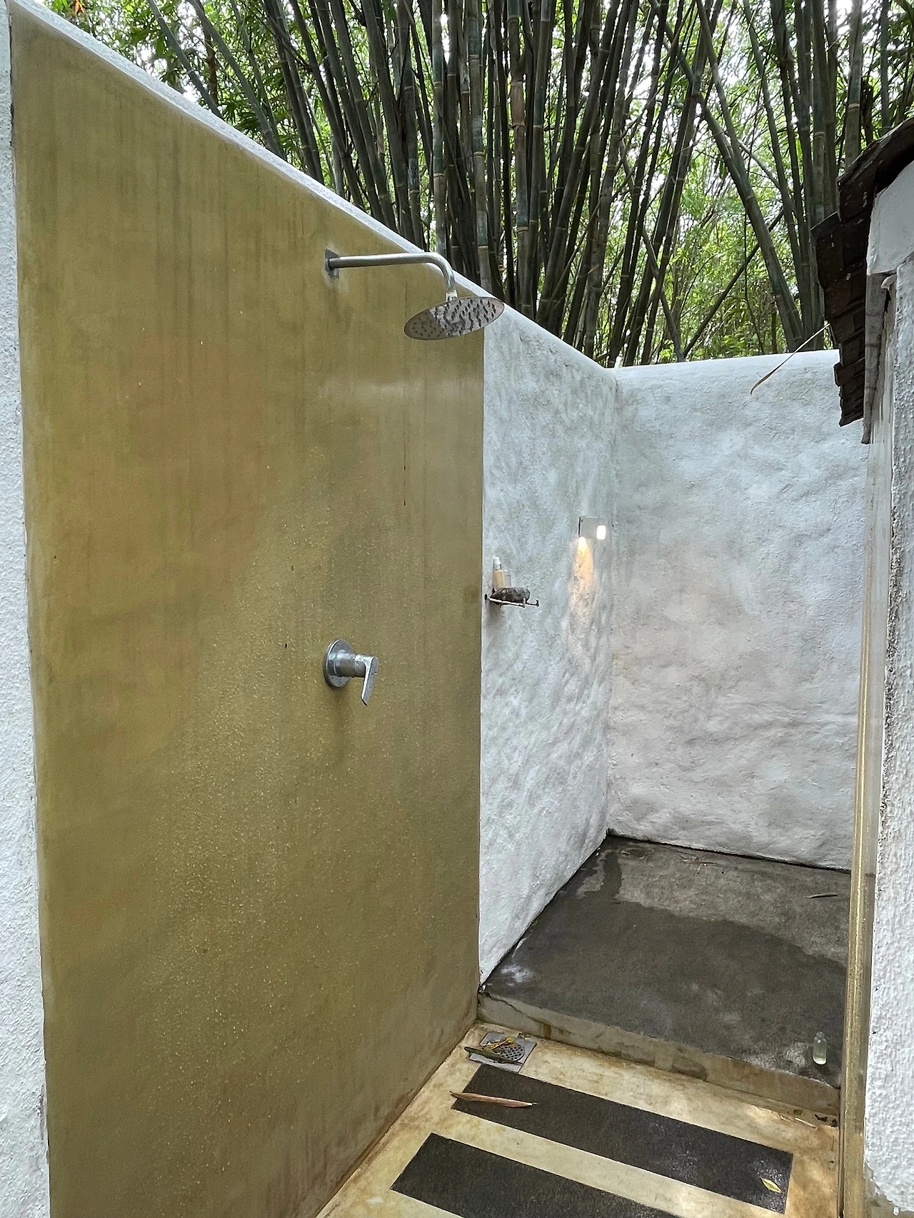 욕실은 오픈 구조예요. 샤워 부스는 야외에 있어요. 하늘 바라보면서 별하고 이야기하면서 샤워할 수 있어요. 야외 수영장에 가서 야외 샤워에서 몸을 헹궈 본 적은 있는데요. 이렇게 지붕 없이 오픈된 샤워공간은 낯서네요. 기분 좋아요. 밤하늘 보면서 샤워하는 기분 색달라요. 비 오면 더 색달랐을 거예요.