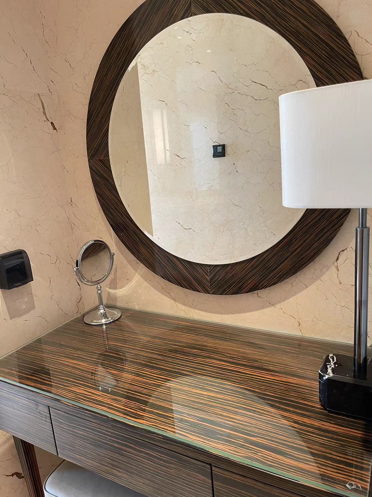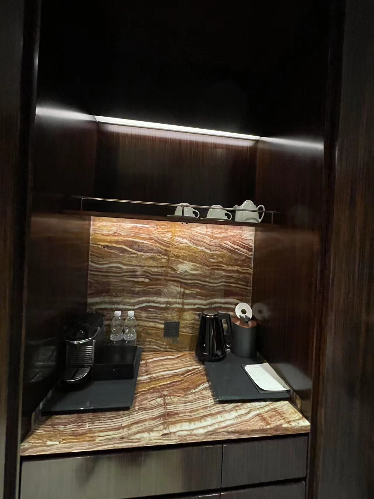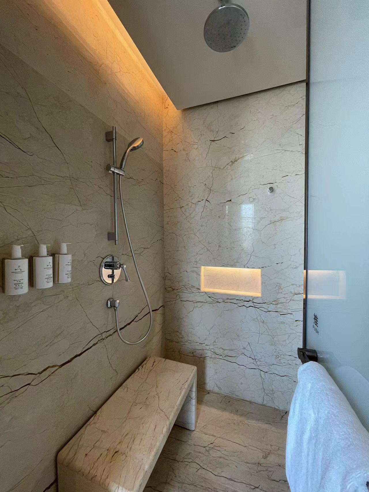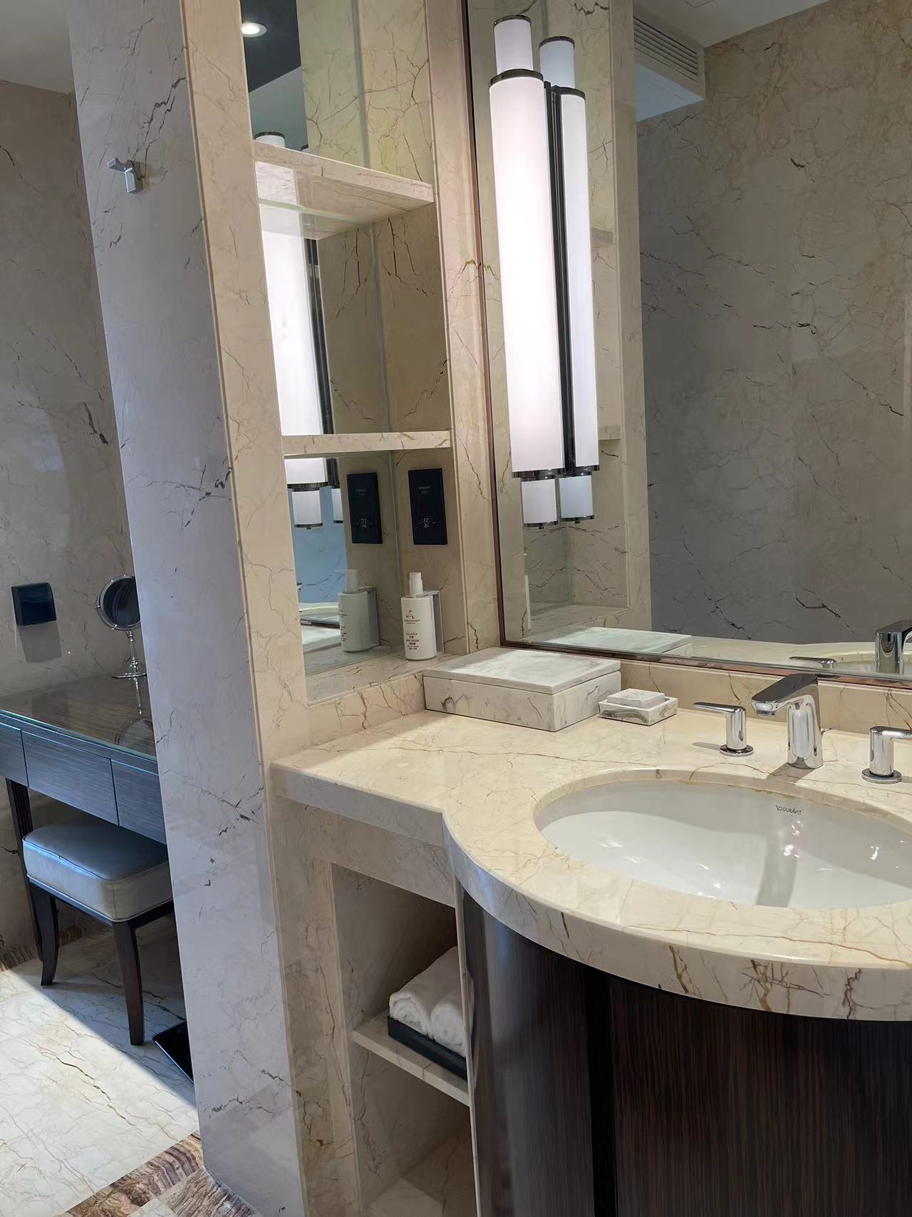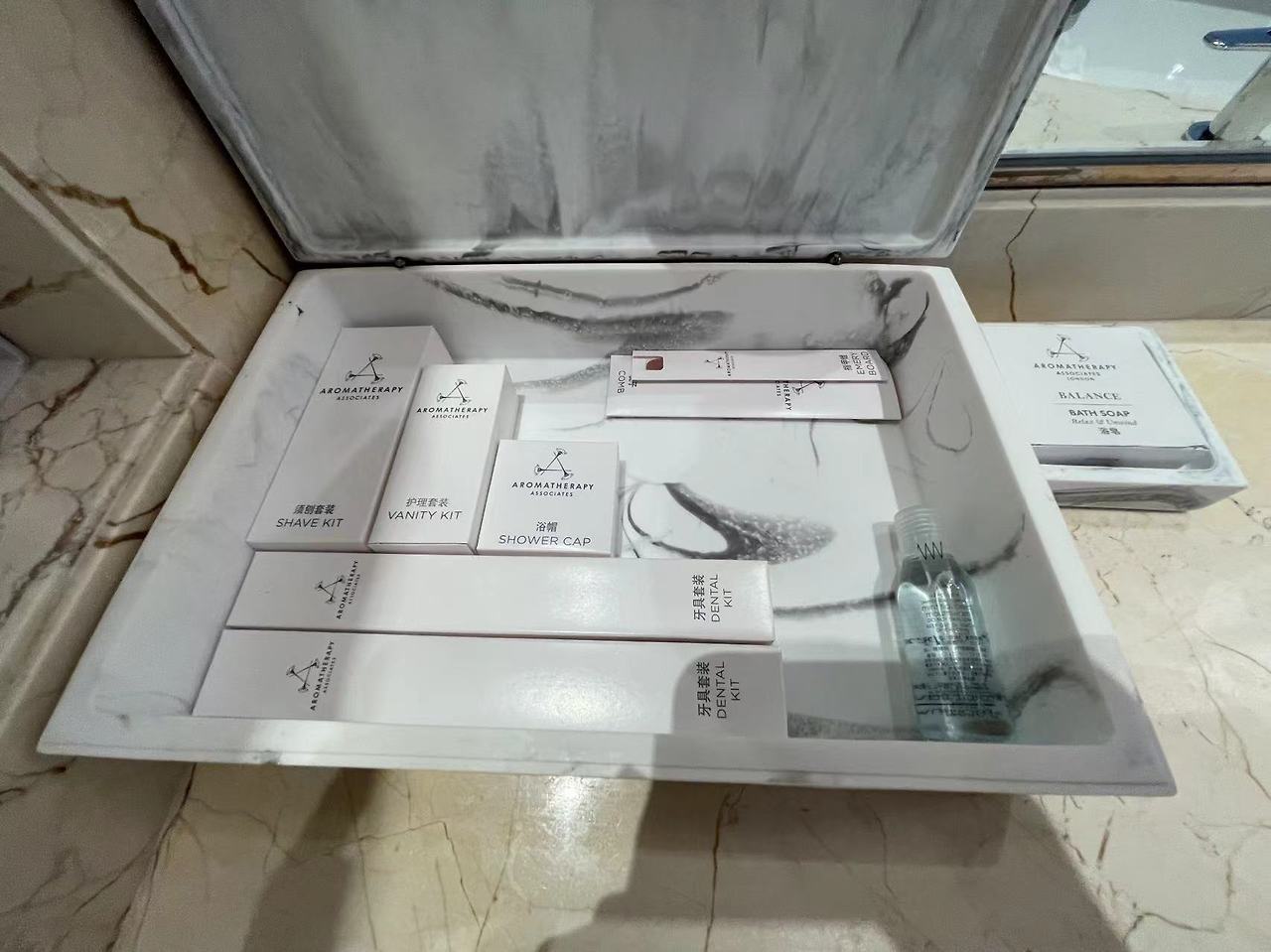 객실 인테리어는 브라운 색 목재 가구와 카페트바닥으로 클래식한 느낌이에요. 포시즌 호텔 객실 비슷한 느낌이에요. 뷰는 코너 스위트라 양쪽으로 다 잘 보이고요. 세면대 두개 사이에 별도 화장대가 있어요. 샤워부스, 욕조, 화장실 다 분리되어 있어 동선은 좀 기네요. 어메니티는 아로마테라피인데요. 어떤 브랜드를 가지고 있어도 다 중국 생산이에요. 중국 화장품 생산 능력이 엄청나네요.