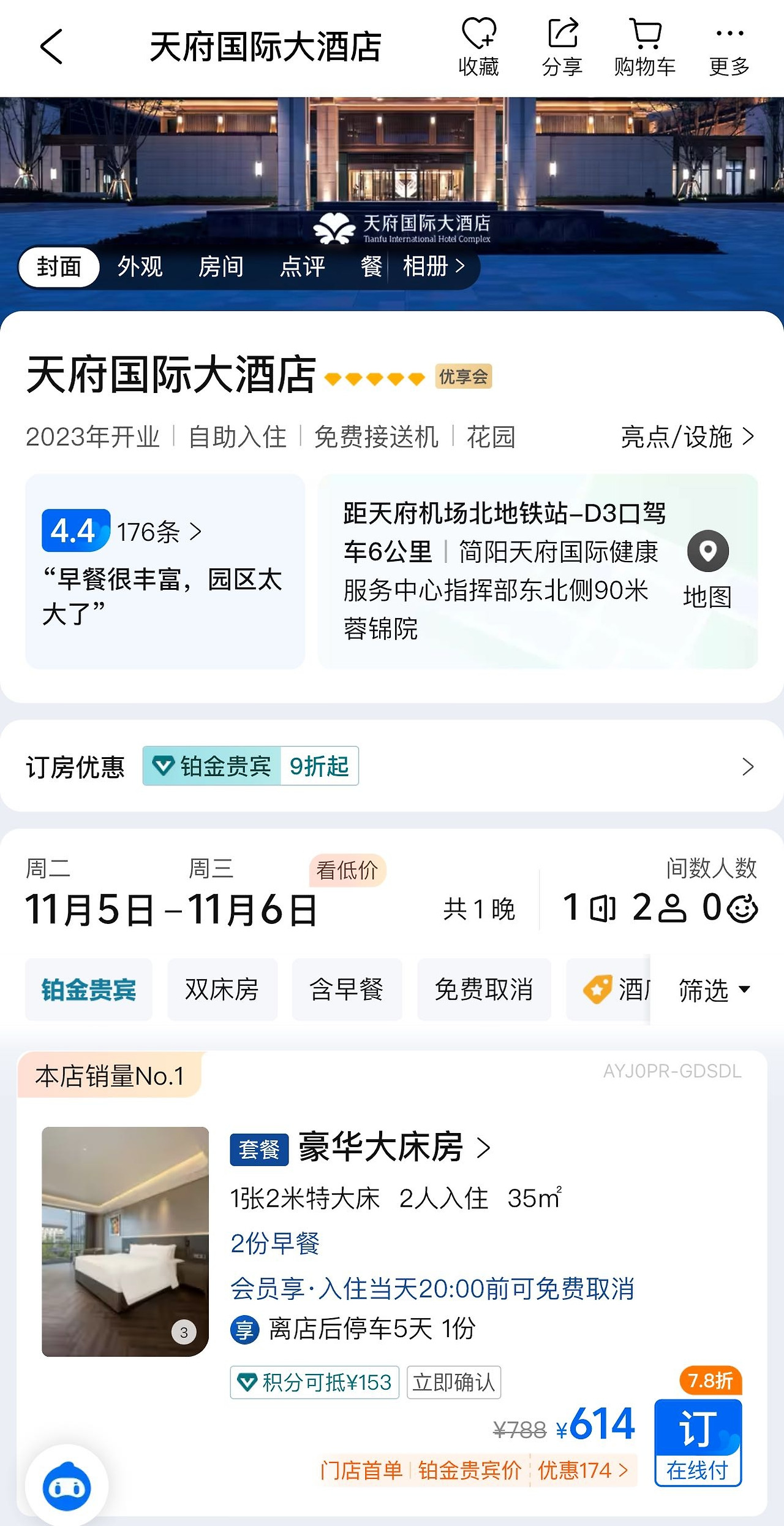청두티앤푸成都天府国际酒店라는 호텔로 이동해 하루 자는데요. 단체패키지용으로 세워진 호텔이에요. 2023년에 오픈한 신상호텔이라 깨끗하네요. 씨에청앱에서 2인 1실에 600위안 정도로 검색되네요. 넉넉하게 계산해 1인당 300위안