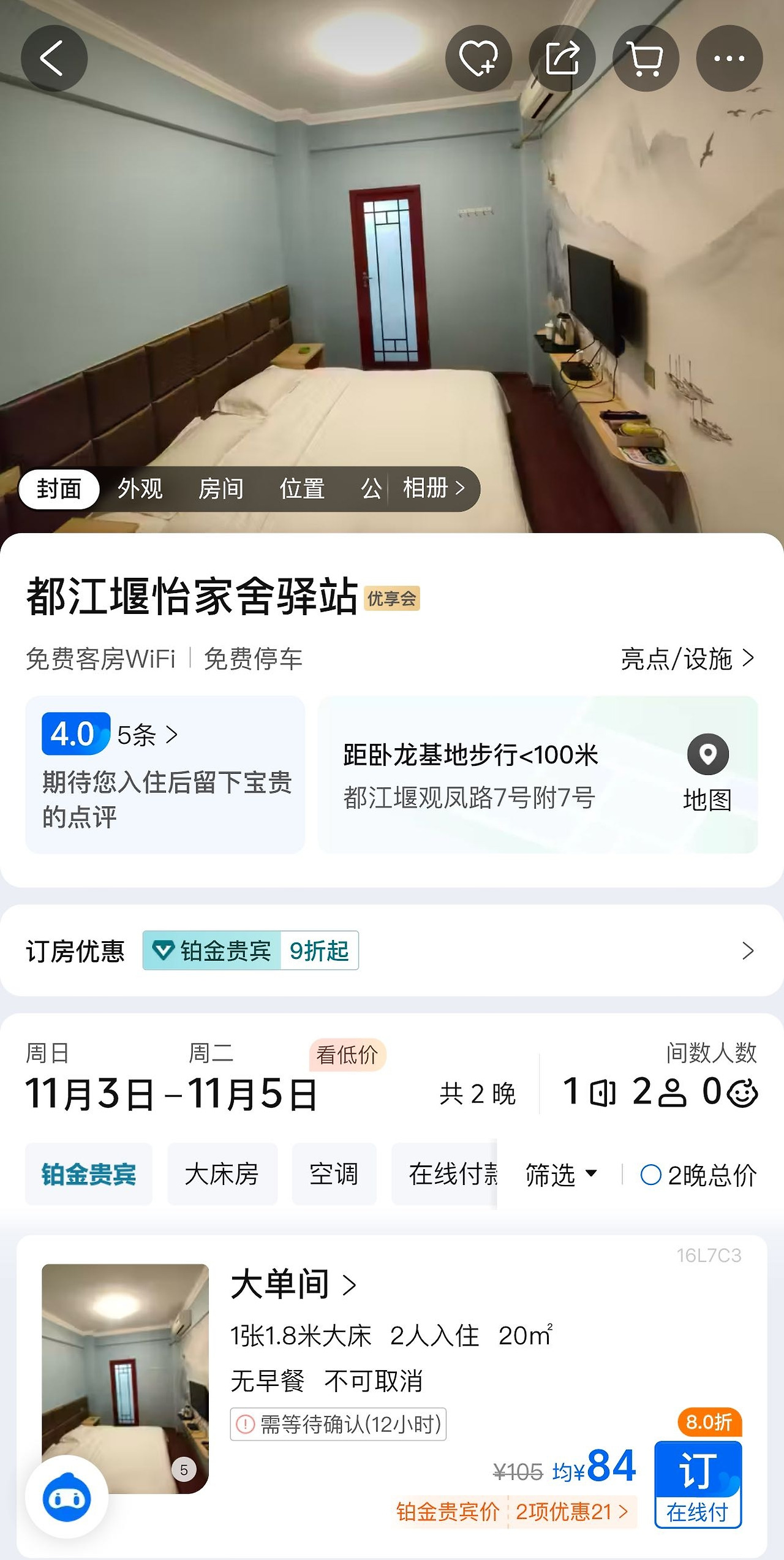 민박집은 강바오 님도 묵으며 유명해진 무위에칭강沐月青岗민박집이거나 비슷한 등급인데요. 이 정도 민박은 상하이에서 가도 2인 1박에 200위안 수준입니다. 넉넉히 계산해 1인당 1박 100위안이에요.