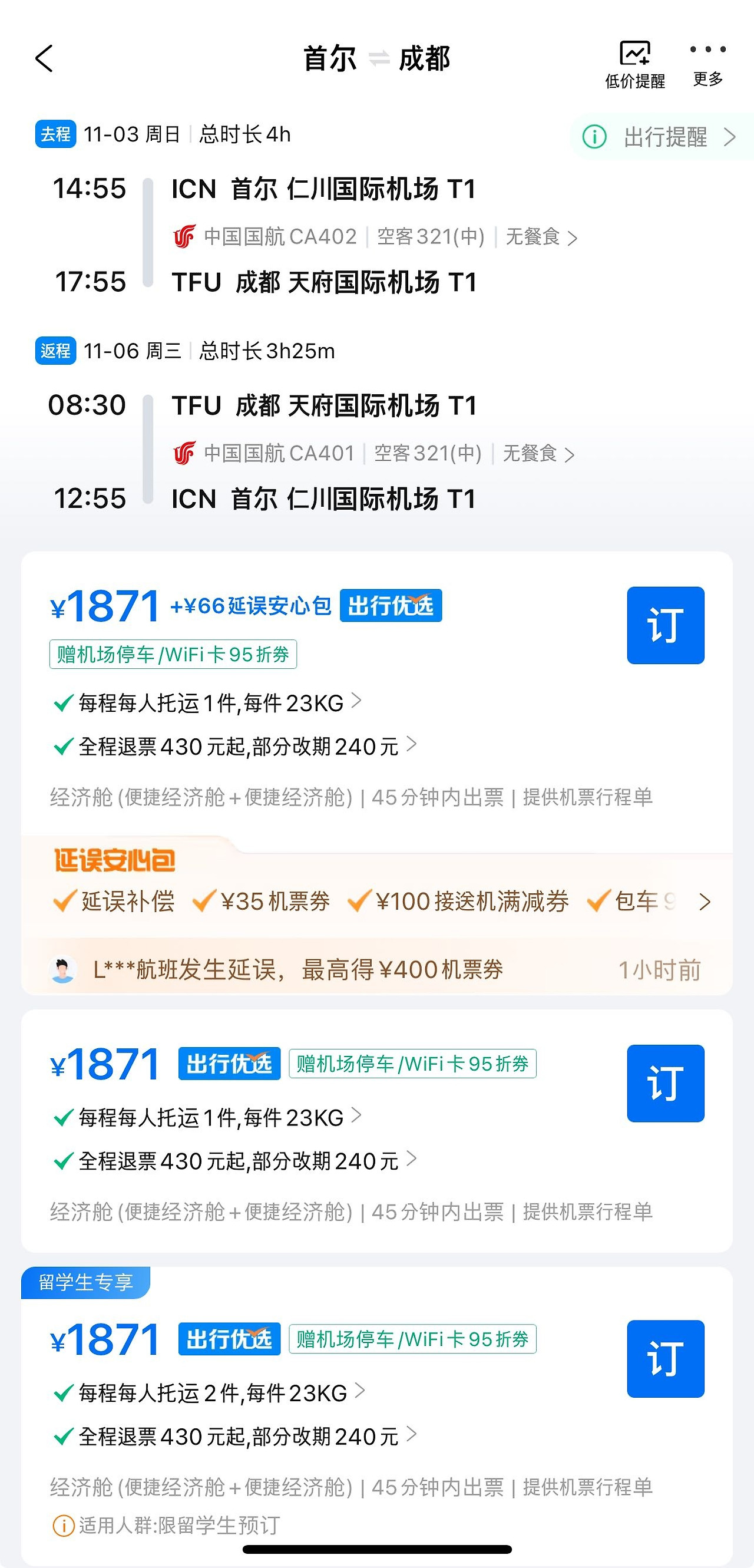 현재 인천-성두는 중구국제항공(쓰촨항공)하고 아시아나하고 운행하는데 요금 차이 크게 안 나요.