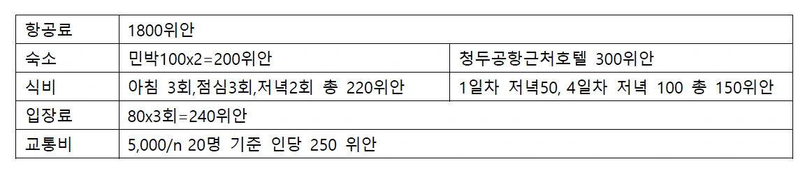총비용 약 3,160위안 한화 60만 원 패키지 비용 130만 원 정도