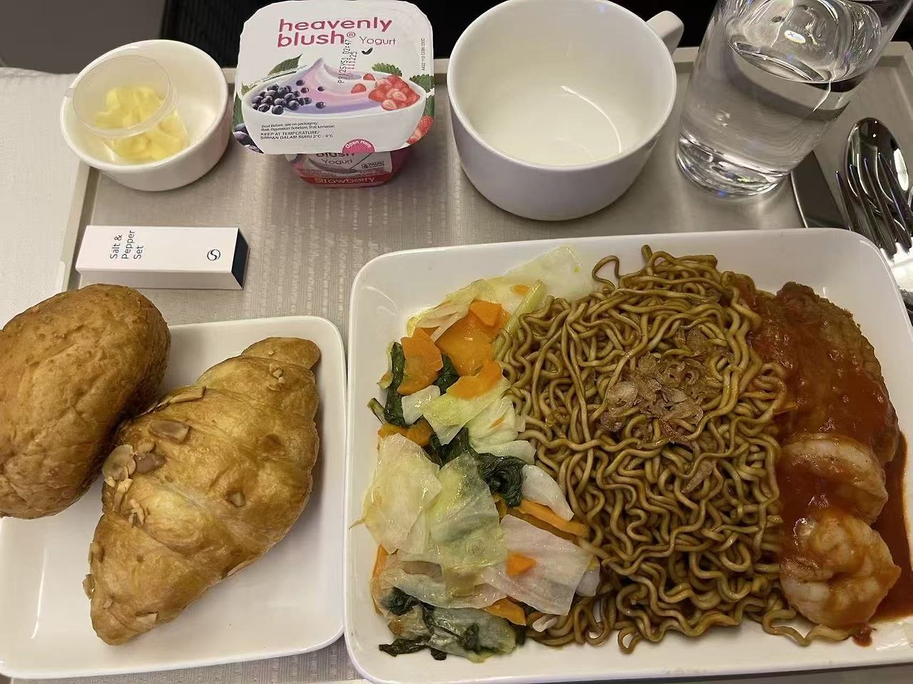미끄럼틀 같은 슬리퍼 좌석이라 꿀잠 하고는 거리가 멀어 깨우지 않아도 일어납니다. 아침 식사라고 제공되는 식사를 보고 순간 중국 국내선 이코노미 기내식인 줄 알았어요. 중국 국내선이코노미 해산물식 신청하면 딱 이렇게 나오거든요. 야채와 주재료인 해산물은 거의 없고 볶음 라면 같은 면만 풍성한 기내식..