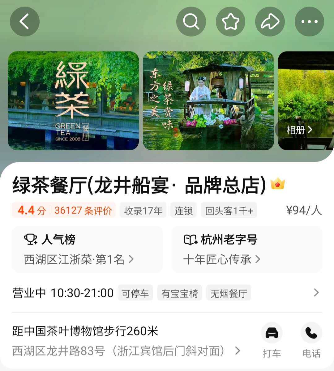 우리는 녹차라는 단어를 들으면 그린티 Green tea를 생각하죠. 중국에서는 그린티라는 뜻 말고도 녹차라는 이름의 식당이 있답니다. 녹차식당은 2008년 서호 용정로 83번지에서 시작해 지금은 중국 전역에 500개가 넘는 체인을 가진 대형 요식업체로 성장했어요. 대도시 웬만한 쇼핑몰에 가면 녹차식당을 쉽게 볼 수 있어요.