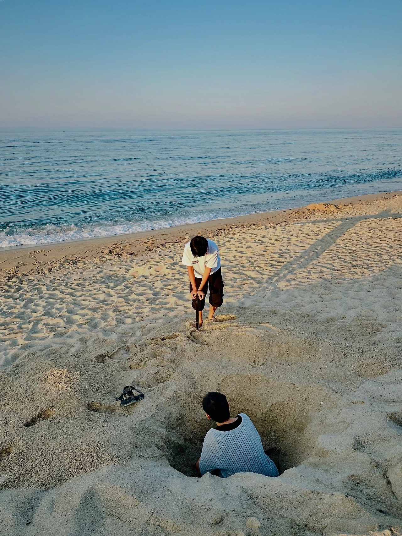 필요 없다던 삽 꺼내와서 혼자 해변으로 걷는다