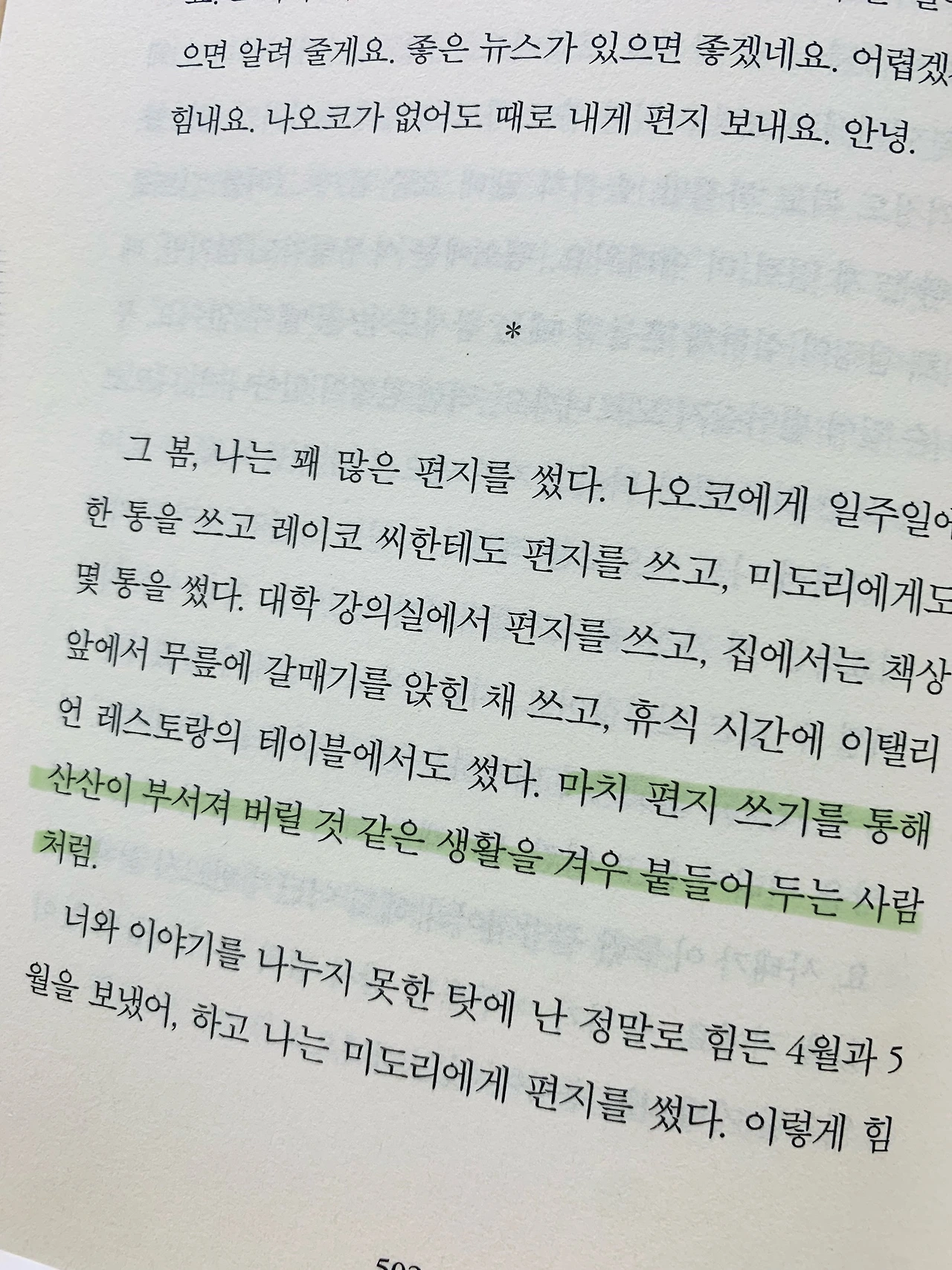 '마치 편지 쓰기를 통해 산산이 부서져 버릴 것 같은 생활을 겨우 붙들어 두는 사람처럼‘