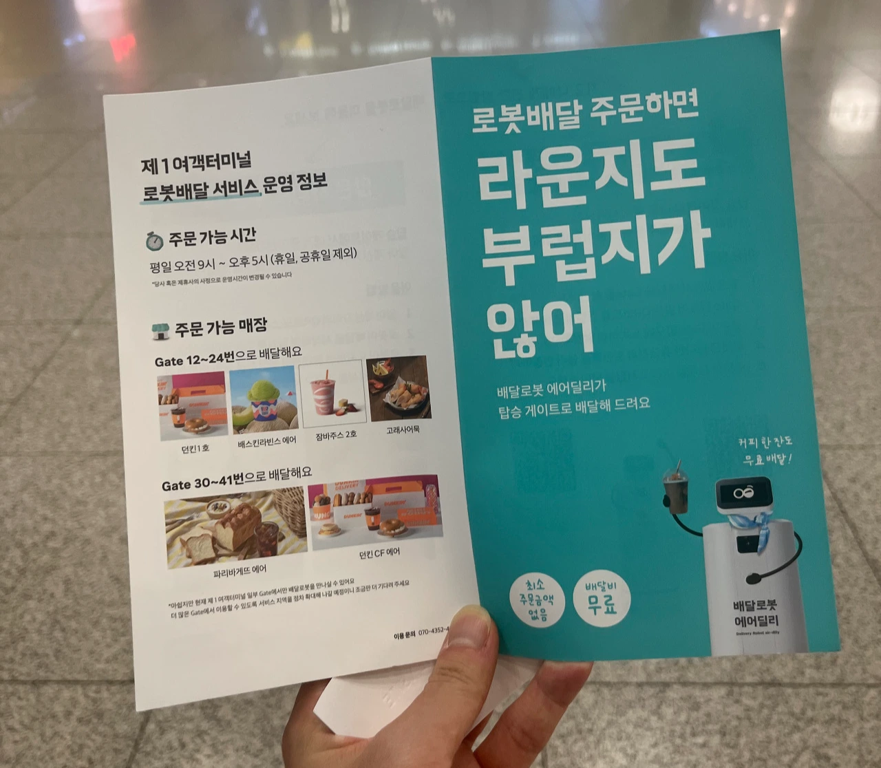 광고는 배달의 민족에서 제1 여객터미널 로봇배달 서비스를 운영하는 정보에 관한 내용이었다. 비행기 탑승을 기다리는 손님이라면 누구나 자유롭게 이용할 수 있는 배달 서비스이다. 라운지도 부럽지 않다는 카피라이팅처럼, 주문만 하면 고객이 있는 탑승게이트로 던킨도너츠, 베스킨라빈스, 잠바주스, 고래사어묵, 파리바게뜨를 무료로 배달해준다.