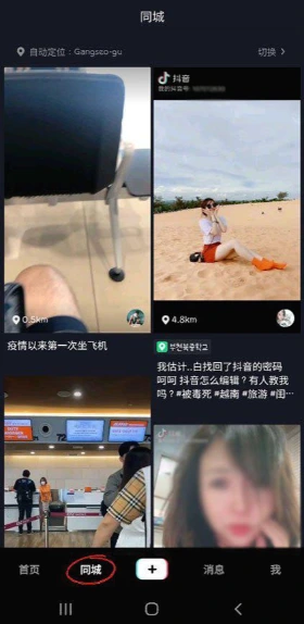 틱톡의 경우, 하단 메뉴바에 ‘검색' 기능이 위치해 있는데, 더우인의 경우 같은 위치에 ‘부근'이라는 기능이 있습니다. 틱톡은 검색을 클릭하면 인기 해시태그, 장르별 영상이 보이는 반면, 더우인의 '부근' 기능을 클릭하면 자신의 인근 사용자와 o2o 구매 매장 등, 지역 기반의 정보가 제공됩니다.