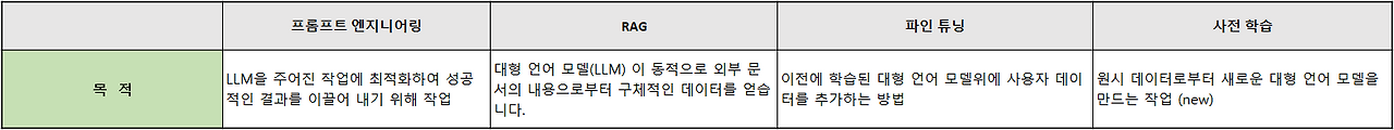 프롬프트엔지니어링(Prompt Engineering): 비교적 낮은 비용과 쉬움 정도의 난이도. 명확한 지시와 샘플 데이터를 작성하는 데 시간이 소요됩니다.