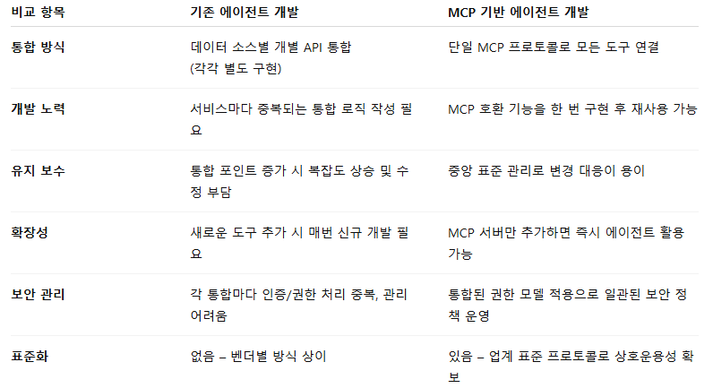 기존의 AI 에이전트를 개발할 때는 외부 데이터나 툴을 사용할 경우 각각의 서비스별로 개별 통합을 구현해야 했습니다. 예를 들어 Slack에서 메시지를 가져오고 싶다면 Slack API를, 사내 DB에 질의하려면 DB용 API나 드라이버를, 구글 캘린더를 쓰려면 또 별도의 API를 직접 코드로 연동해야 했습니다. 이처럼 데이터 소스마다 “각기 다른 문과 열쇠”가 필요한 격으로, 개발자는 서비스마다 다른 인증 방식, SDK, 에러 처리, 데이터 형식을 모두 처리해야 했습니다. 이러한 전통적 통합 방식의 결과로 개발 초기 비용이 많이 들고, 통합 포인트가 늘어날수록 시스템이 복잡해져 유지보수가 어려워지며(새 API 변경 시 각각 수정 필요) 보안 취약점도 늘어날 수밖에 없습니다.
