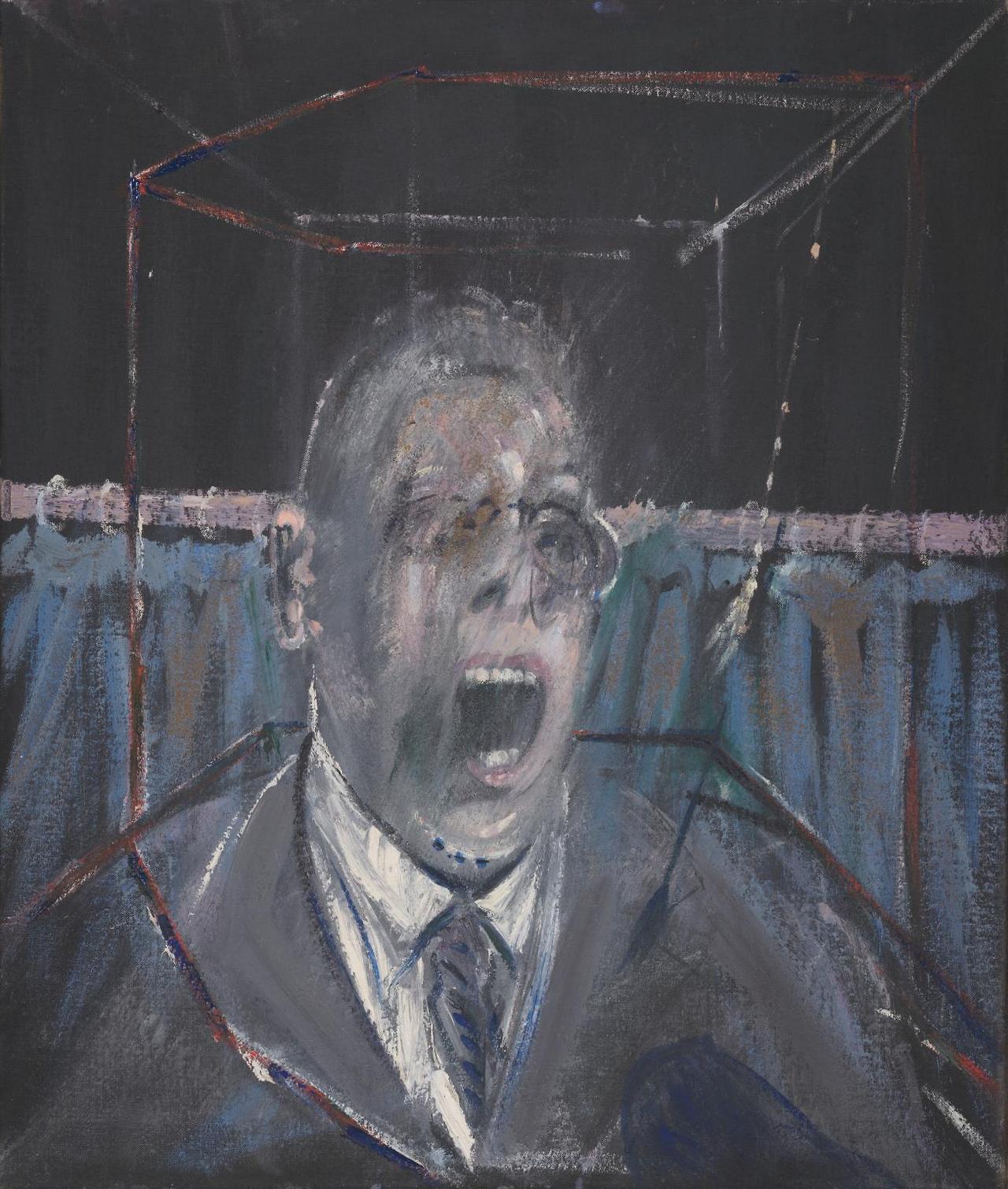 베이컨의 회화에는 프레임이 있다. 이 프레임이란 액자와 같은 작품 자체의 테두리 같은 파르마콘*이 아니라 제재(subject)로서의 테두리다. 베이컨은 테두리 자체를 작품 안에 담는다. 그것은 육면체와 같은 입체도형인데, 면은 없으며 오로지 모서리만 존재한다. 그것은 유리로 된 입방체인 것일까? 아니면 그저 선만 존재하는 뼈대에 불과한 것인가? 이러한 테두리는 비명을 지르는 피사체를 담고 있다. 다르게 말해서 비명 지르는 존재는 그 테두리 안에 갇혀있다. 갇혀있어서 비명을 지르는 것인지, 아니면 비명을 지르는데 그 안에 있는지 정확한 해석은 불가능해 보인다. 비명을 지르는 형벌로 테두리에 갇힌 것인가? 아니면 테두리에 갇혀서 비명을 지는 것인가? 이러한 테두리는 고립감과 긴장감을 강화하고, 인물과 배경을 분리시켜 존재의 불안정성을 드러내는 실존주의적 요소로서 그림의 내러티브를 더 어둡고 풍부하게 만든다.