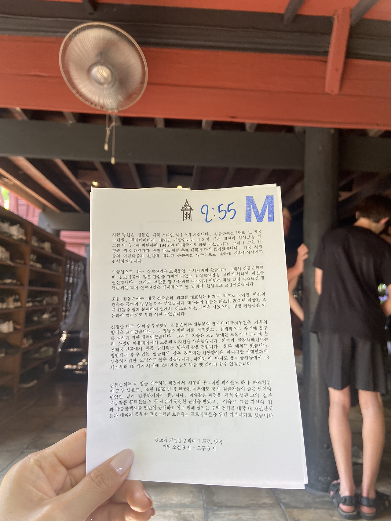 부자 아저씨가 예쁜 집을 짓고 각종 유물들과 예술품을 사들였군요. 사람은 찍지 말고 셀카도 찍지 말고 집은 찍어도 된다고? 뭔 그런.. ㅋㅋ 투어는 40분이 걸렸고 영어 가이드는 천천히 또박또박 말해서 영어 듣기 40분이 그리 힘들진 않았다. 짐 톰슨이 언제 태어나 언제 실종되었고 각종 유물들이 언제 만들어져서 어떻게 이곳에 왔는지, 집을 어떻게 지었는지, 누가 여기 다녀갔는지… 뭐 그런 얘기였는데 긴 기다림에 비해 그리 대단할 것은 없다. ㅡㅡ