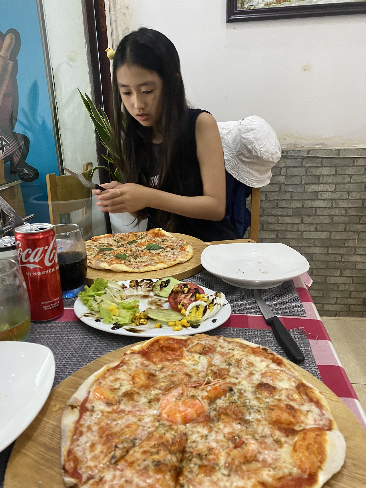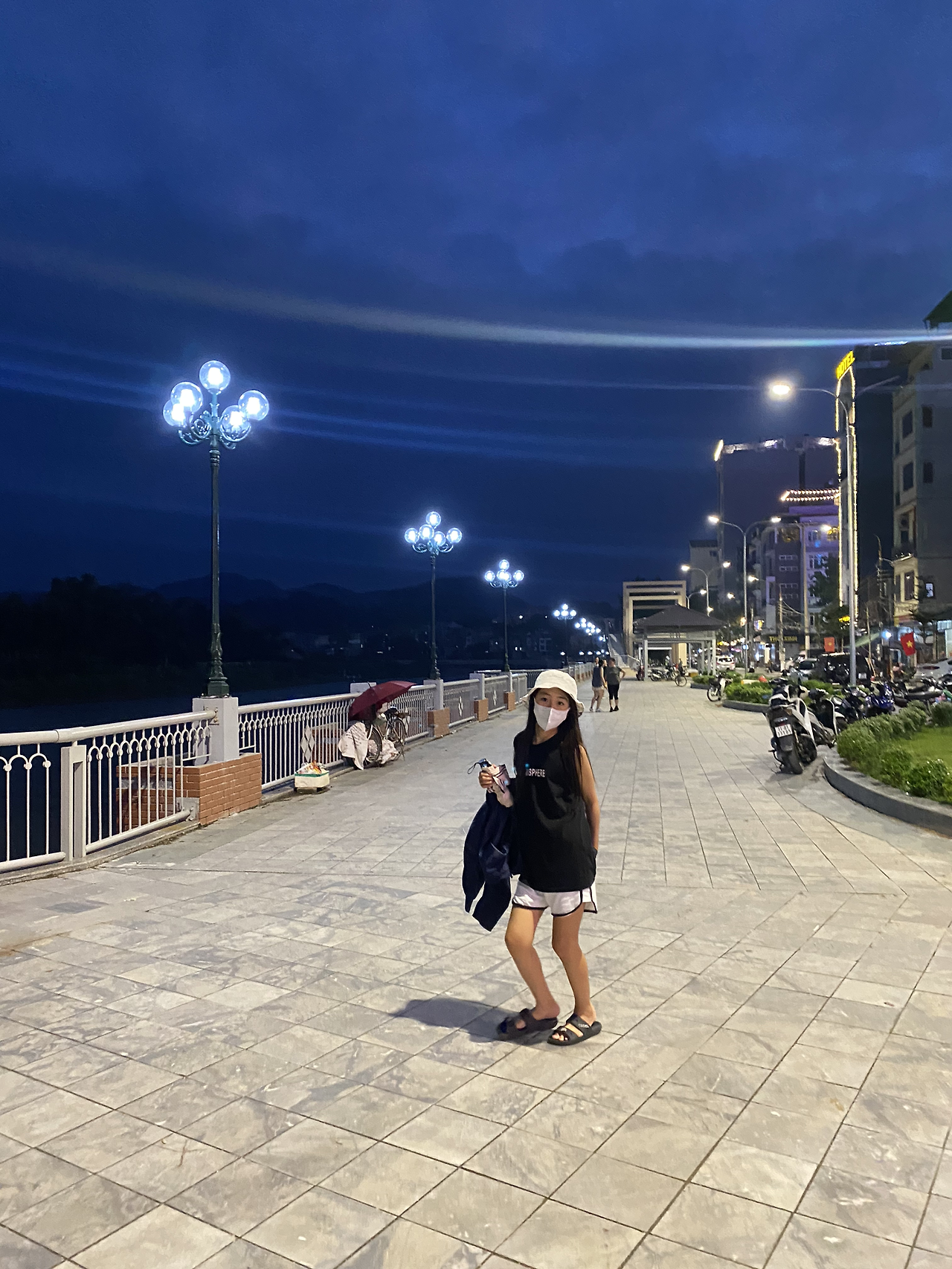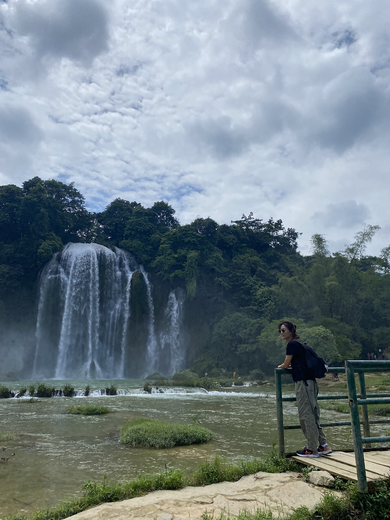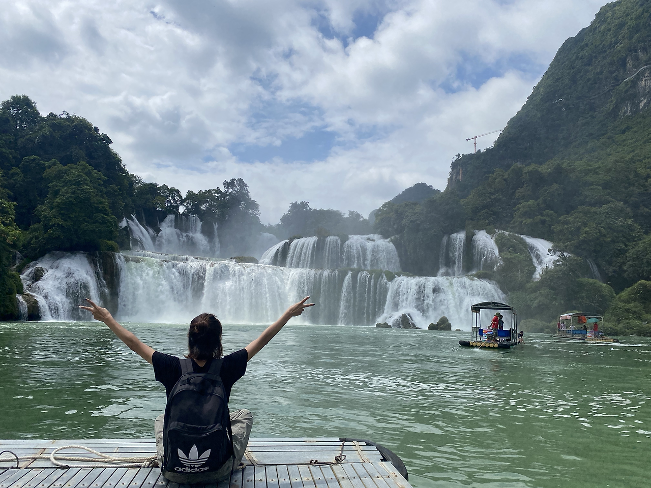 시내에서 3시간이 넘는 거리였다. 비 온 뒤라 수량도 많아 장관이다. 바로 건너편으로 중국 초소가 보인다. 뗏목을 타고 폭포 가까이 갈 수 있었다. 요금은 잊어버렸는데 그리 비싸진 않았던 듯~ 오후 2시가 넘어 도착한 데다 비 오고 커브길이 많아 어두워지기 전에 돌아가기로 한다. 돌아가니 5시가 넘었다. 이때 돌아가서 기쁜(?) 소식을 듣게 되는데 오토바이샵 아가씨가 우리의 숙소를 구해놨네~ ㅋㅋㅋㅋ 일단 땡큐긴 한데~~ 다음날 버스표는 시간이 지나 환불불가라네 ㅋㅋ 날리자 그냥! 버스표를 몇 시간만 있다 예매할걸… 일단 안심하고, 오토바이는 하루 더 빌리기로 하고, 밥부터 먹자! 딸아이가 현지식이 안땡기나보다. 먹고 싶은 걸 찾아보라 했더니 호텔 근처 피자집을 찾았네~ 결론은 JMT!! 1인 1피자 하고 강변 산책하다 숙소로 갔다.