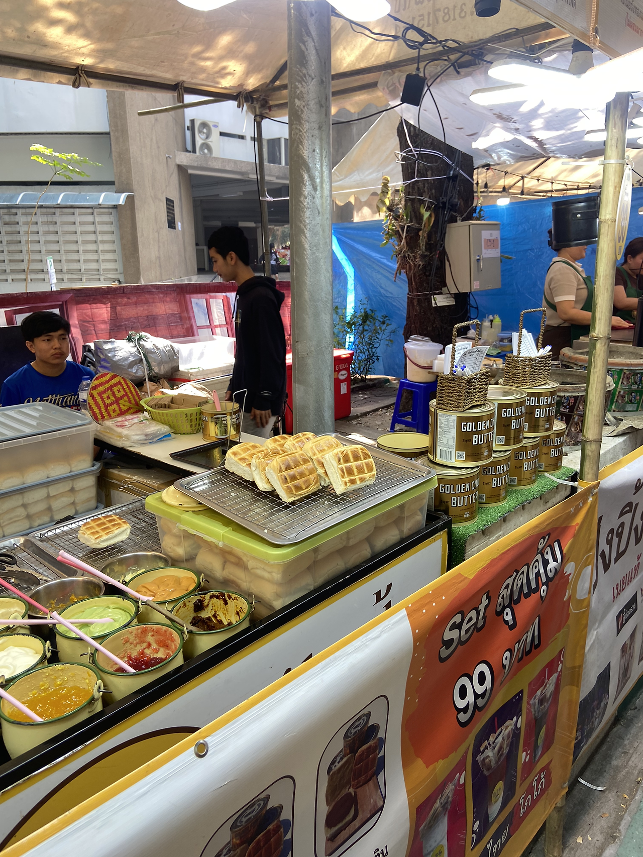먹거리 장터를 걷다 지치면 대학 캠퍼스 벤치에서 휴식을 취했다. 마켓 골목 곳곳에 대학생들 부스가 짜임새 있다.