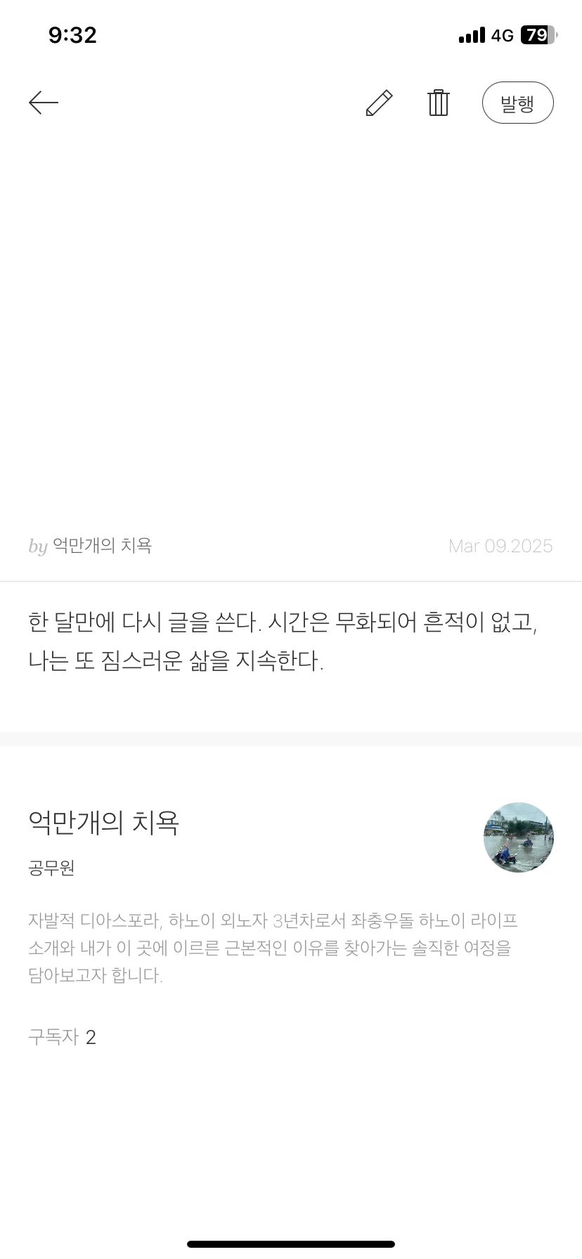 문제는 기안을 하면서 생긴 작은 실수를 나 스스로 받아들이지 못하면서 시작되었다. 관리자가 나를 어떻게 생각할지, 정확히는 나의 업무 능력을 어떻게 생각할지를 신경 쓰기 시작하면서 모든 것이 꼬였다. 거의 하지 않던 실수가 연이어 발생했다. 예를 들면 오타를 내거나 내부망에 안내 메세지를 보내면서 편집이 틀어진 상태로 전송을 해버린 일 같은….. ㅜㅜ 나는 좀처럼 이런 실수를 하지 않는 편임에도 관리자 결재를 받는 일이나 관리자를 포함한 메세지를 보내는 일에 이런 실수가 일어났다. 3월 초 두 번의 이 실수들이 나를 몹시 힘들게 했다. 부서 동료들은 뭘 그런 걸로 그러냐고 위로했지만 관리자와 그 선배에게 나를 비방할 빌미를 준 것 같아 화가 나고 억울함이 밀려왔다. 이 정도면 외상 후 스트레스 장애 아니냐며 친한 선배에게 토로했다.