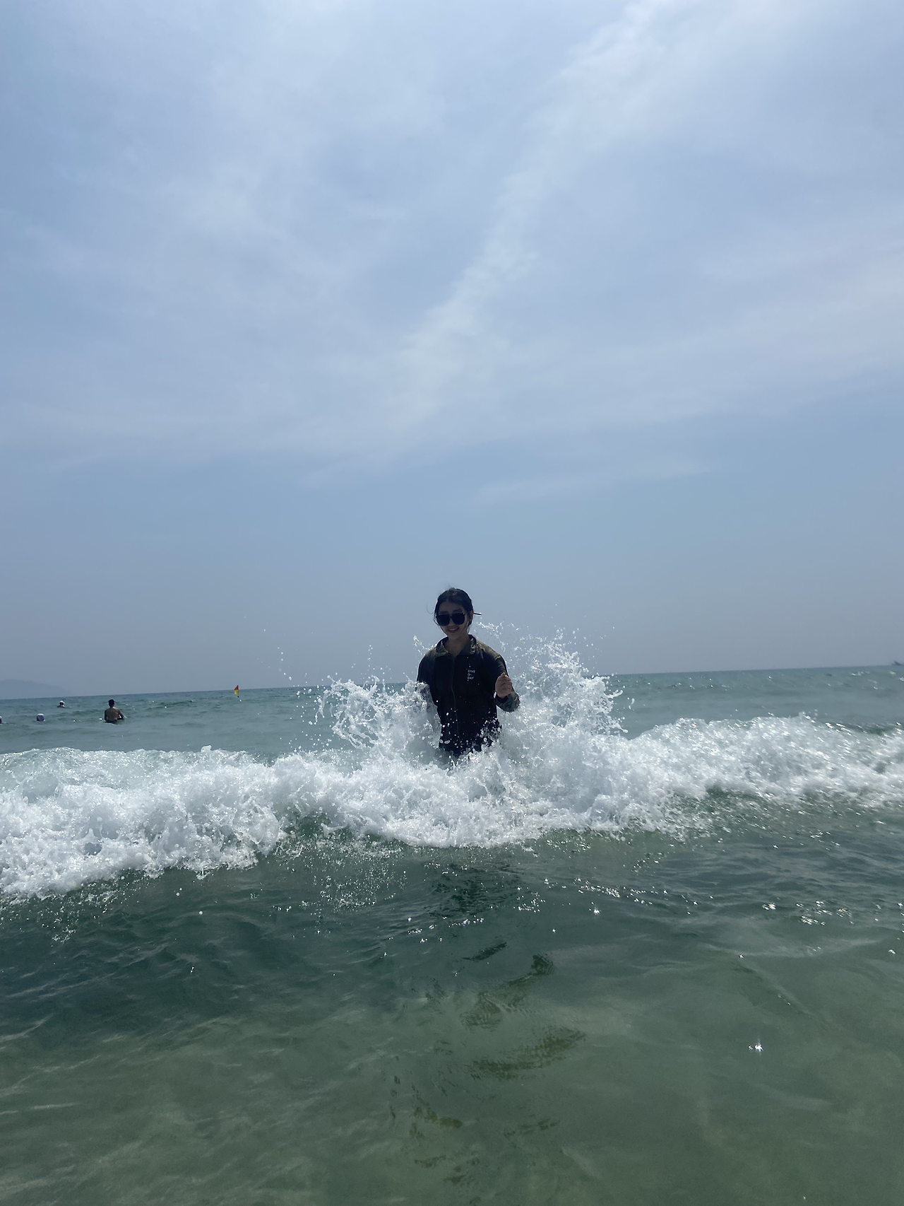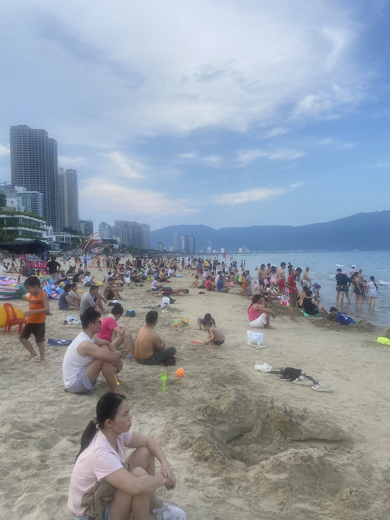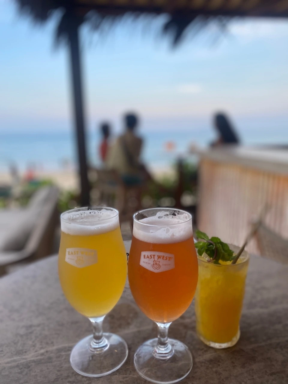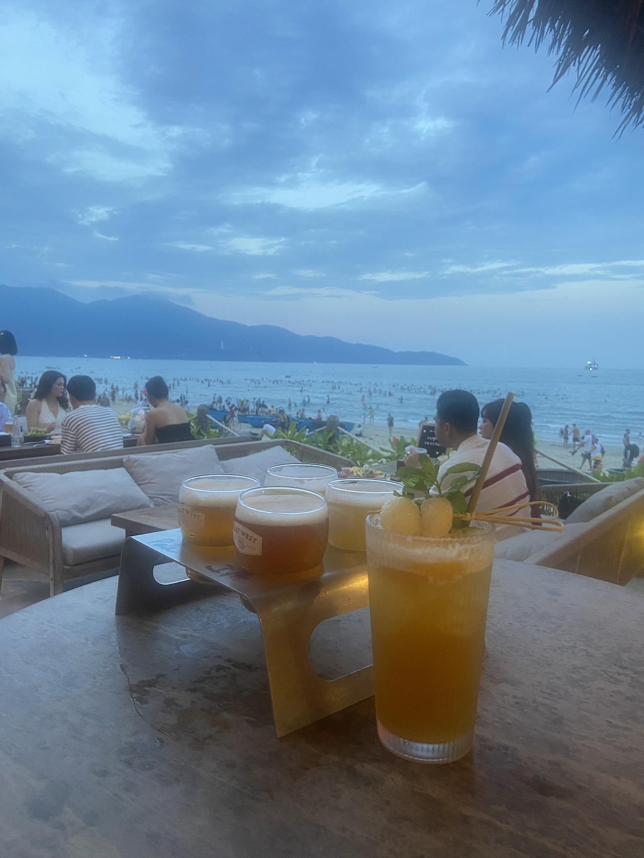 배불리 먹고 또 눕기~ ㅋㅋ 먹고 자고 세상 좋구나~ 뜨거우면 잠시 바다에 뛰어들었다가 또 나와서 몸 말리고… 바닷바람도 너무 좋다…. 그렇게 선배드에서 앞뒤로 굽다 보니 나는 “탔다!!” 뭐든 잘 구워야는데… 너무 탔네…5시에 자리 정리하고 미케비치 위쪽 다낭 비치 쪽으로 해변을 걷기로 한다. 미케 비치가 외국인들이 많은 반면 다낭 비치는 현지인들이 많다. 선배드가 아닌 모래사장에 짐을 풀고 가족끼리 연인끼리 북적거린다. 좀 더 올라가면 내가 지난번 갔던 맥주 바가 있다. 두 잔 다 내 거~~ 딸아이는 주스~~