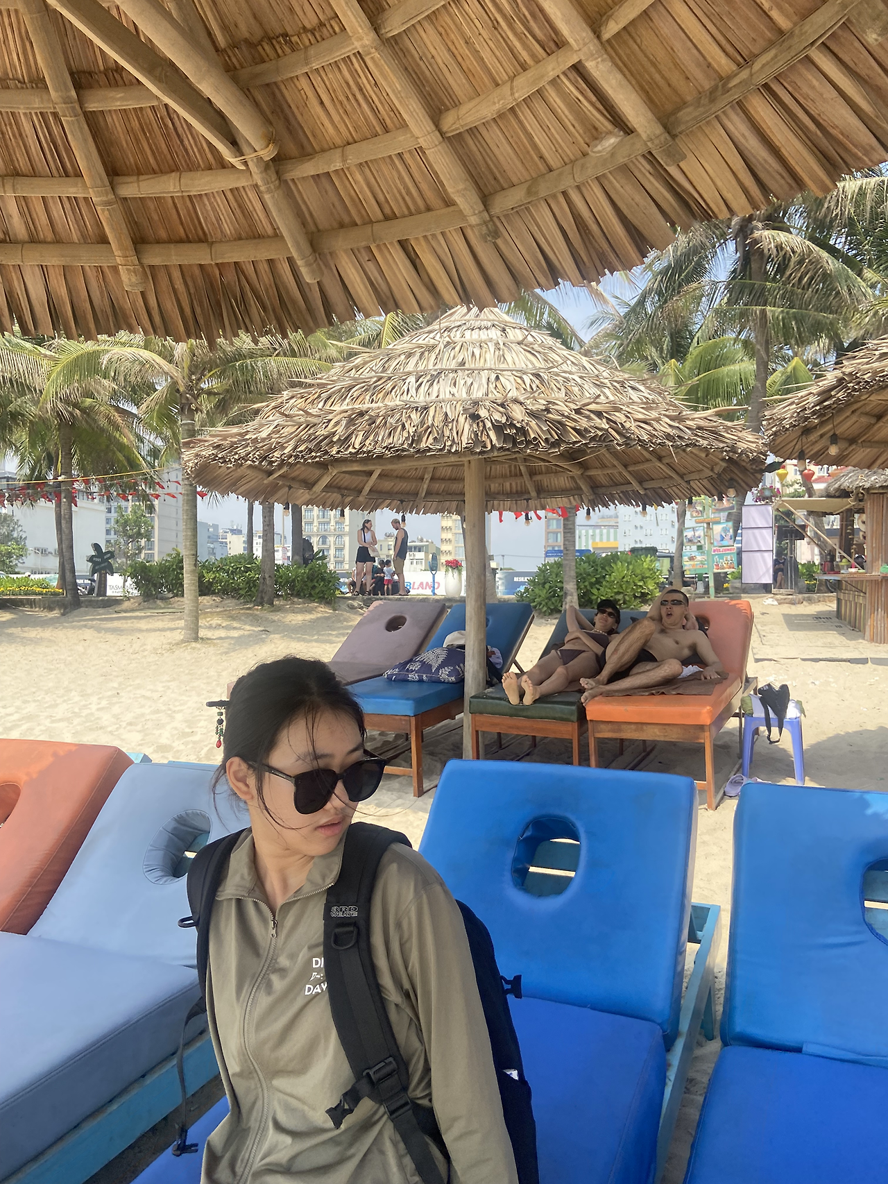 아침에 일어나 조식을 먹고 수영복 갈아입었다. 오늘은 미케 비치에서 멍때리며 쉬기로…. 총총총 바다로 가 어디에 자릴 잡을지 둘러본다. 깨끗한 선배드 찾기!! 무엉탄 호텔 앞에 헤드에 구멍 뚫린 선배드가 있다. 오~~ 맘에 든다. 엎드려 잘 때 좋겠네~~~ 여기로 할게욧!! “바우니에우” 하니 본어쩌고.. 본이면 4..40만동이여??? 성수기라 비싼가??? 바보 같이 4만동을 40만동으로 알아 들었네. ㅋㅋㅋ 하루 종일 4만동이니 좋다 좋아~~~ 게다가 수건도 깔아주고 지저분하지만 베게까지 주심~~~ 아침부터 오후 5시까지 거의 7-8시간을 여기 있게 되는데 중간중간 맥주와 코코넛도 여기서 사 먹어주면서 자리값에 보탰다.