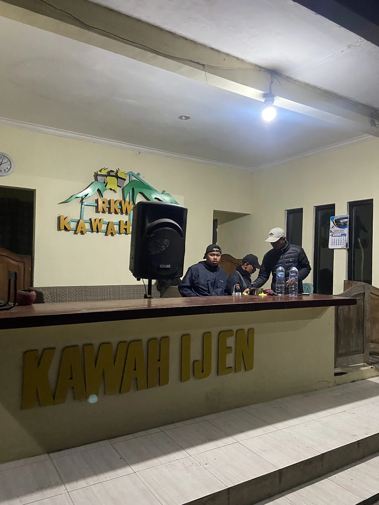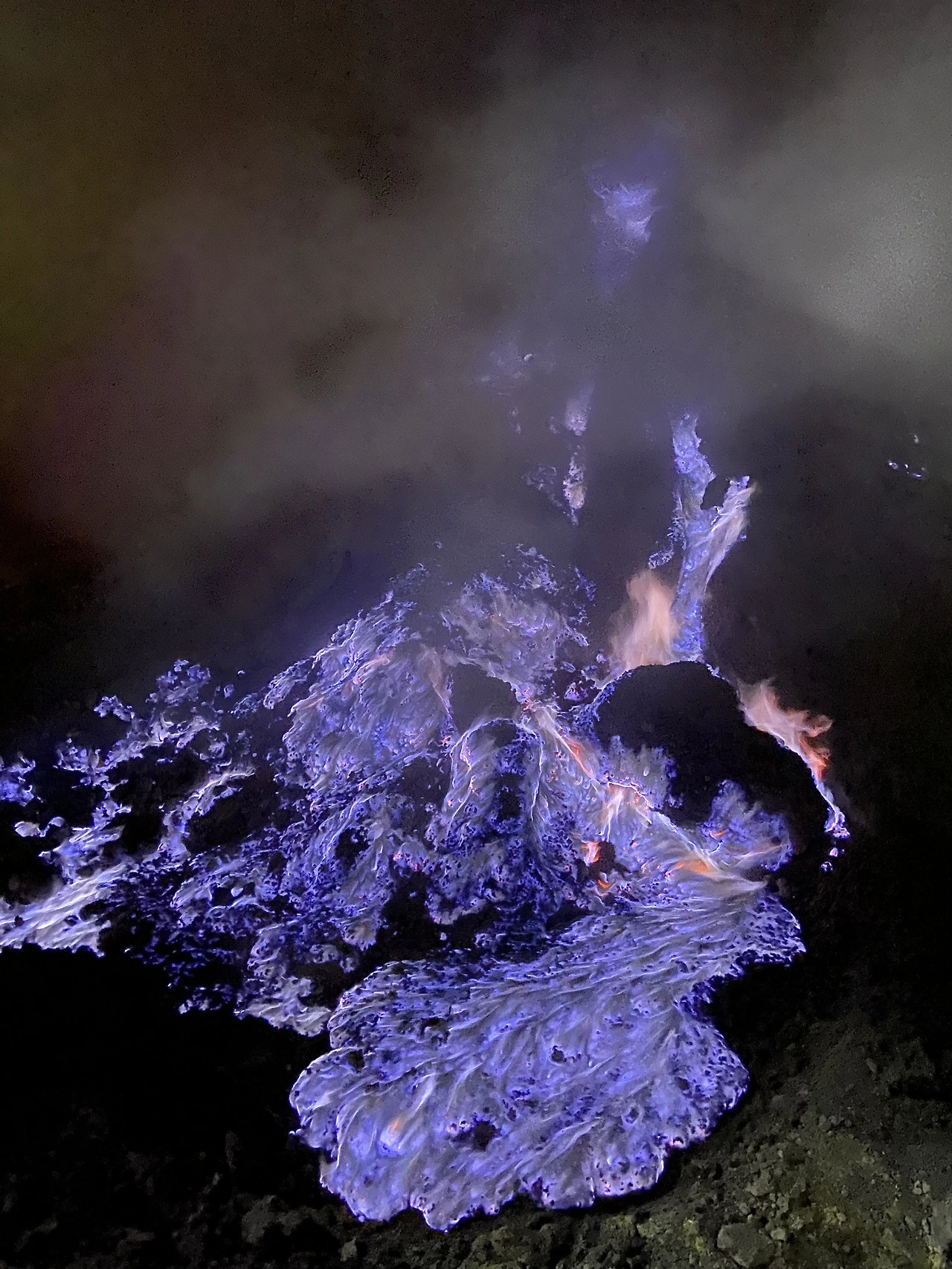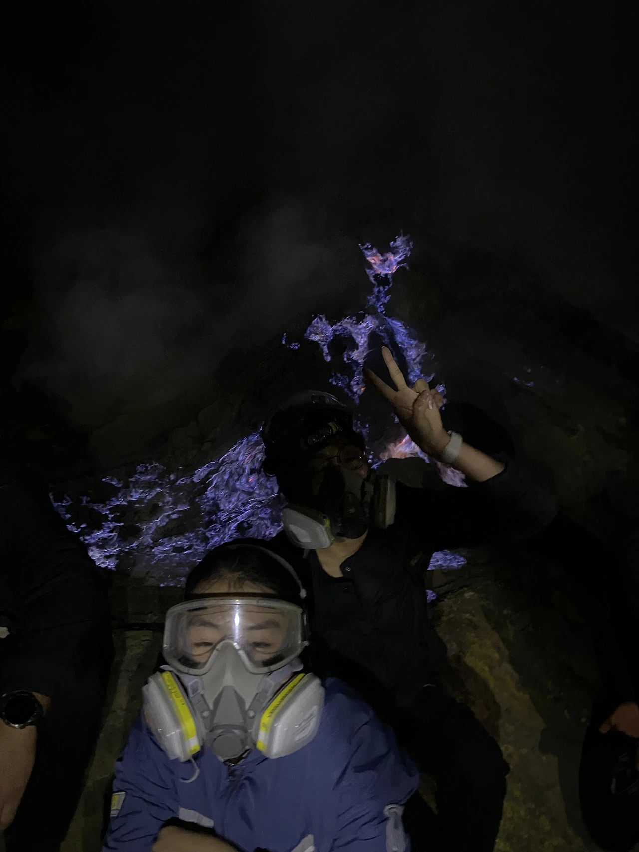 드디어!! 블루 파이어 영접!!! Wow!!!!! 언빌리버블~~~ 너무 아름답다. 가까이 가니 열기가 훅 온다. 사진을 찍으려는 사람들로 붐빈다. 우리는 비교적 일찍 도착한 그룹에 속해 그나마 가까이서 사진도 찍고 블루 파이어도 잘 볼 수 있었다. 3시에서 5시 사이 해뜨기 전에만 보인다는 블루 파이어를 4시 조금 넘어 보았던 것이다. 늦게 올라온 사람들은 블루파이어를 못 봤다.(우리가 올라가는 동안에도