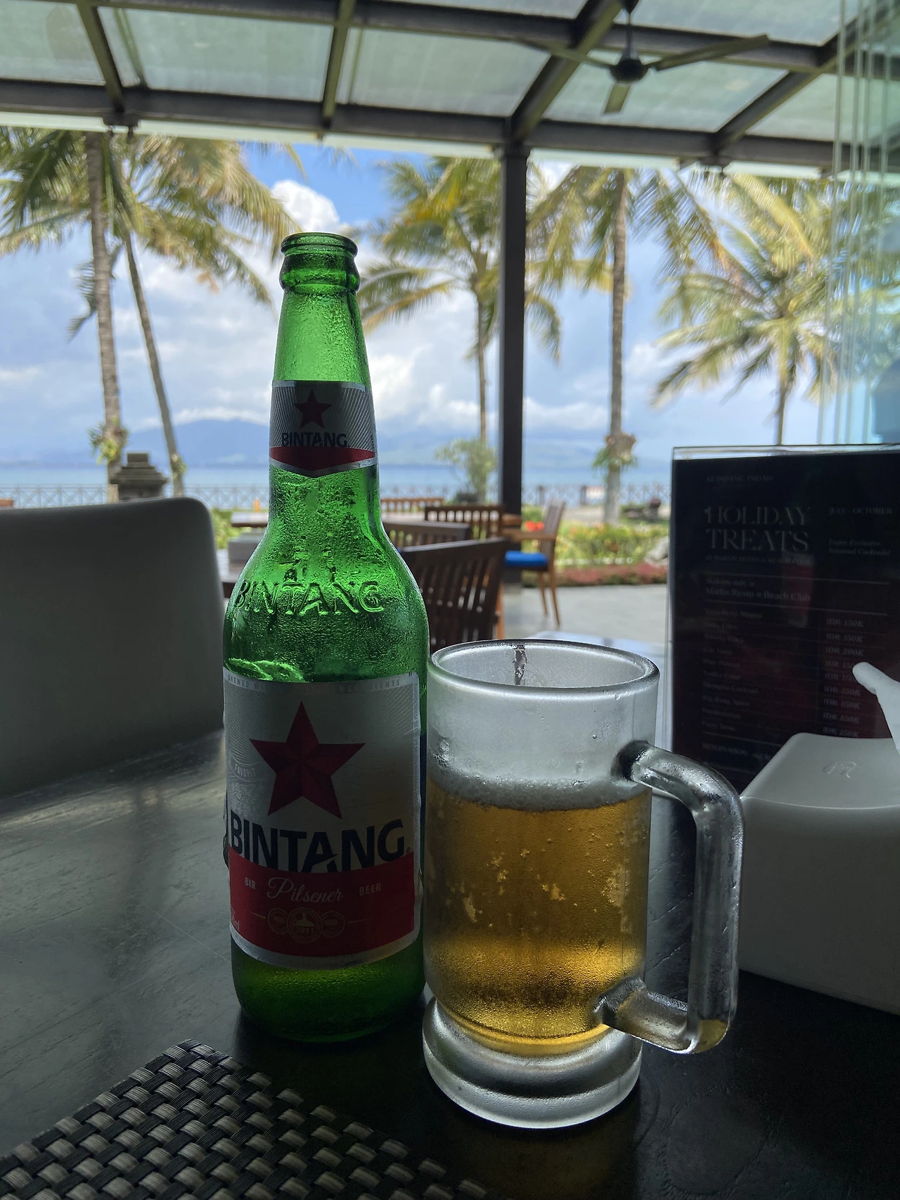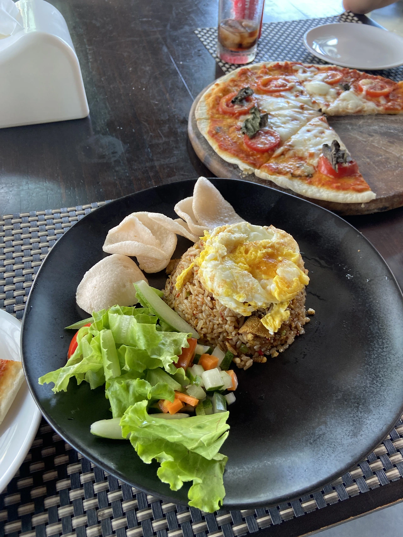 이번 호텔은 (Ketapang Indah Hotel) 숙소 컨디션도 좋고 바다 뷰도 좋다길래 예약했는데 역시나 관리가 잘 되어 있다. 12시에 갔는데 체크인이 3시라 룸이 준비되면 연락 준단다. 덥기도 하고 제대로 된 밥을 먹고 싶어 호텔 레스토랑으로 갔다. 흐미~ 비싸네~ 나의 물가 기준은 맥주!! ㅋㅋ 빈땅 라지가 11만 루피아~ 만원? ㅋㅋㅋ 일단 나시고랭과 피자 맥주 콜라 시킴~ 맛은 나쁘지 않으나.. 5만 원 나옴~ ㅋㅋㅋ 어제 5천 원에 먹은 밥이 생각난다.