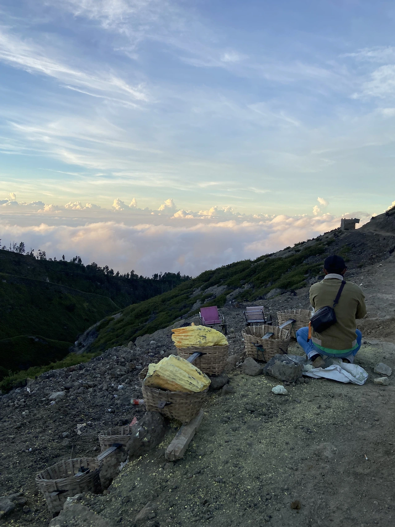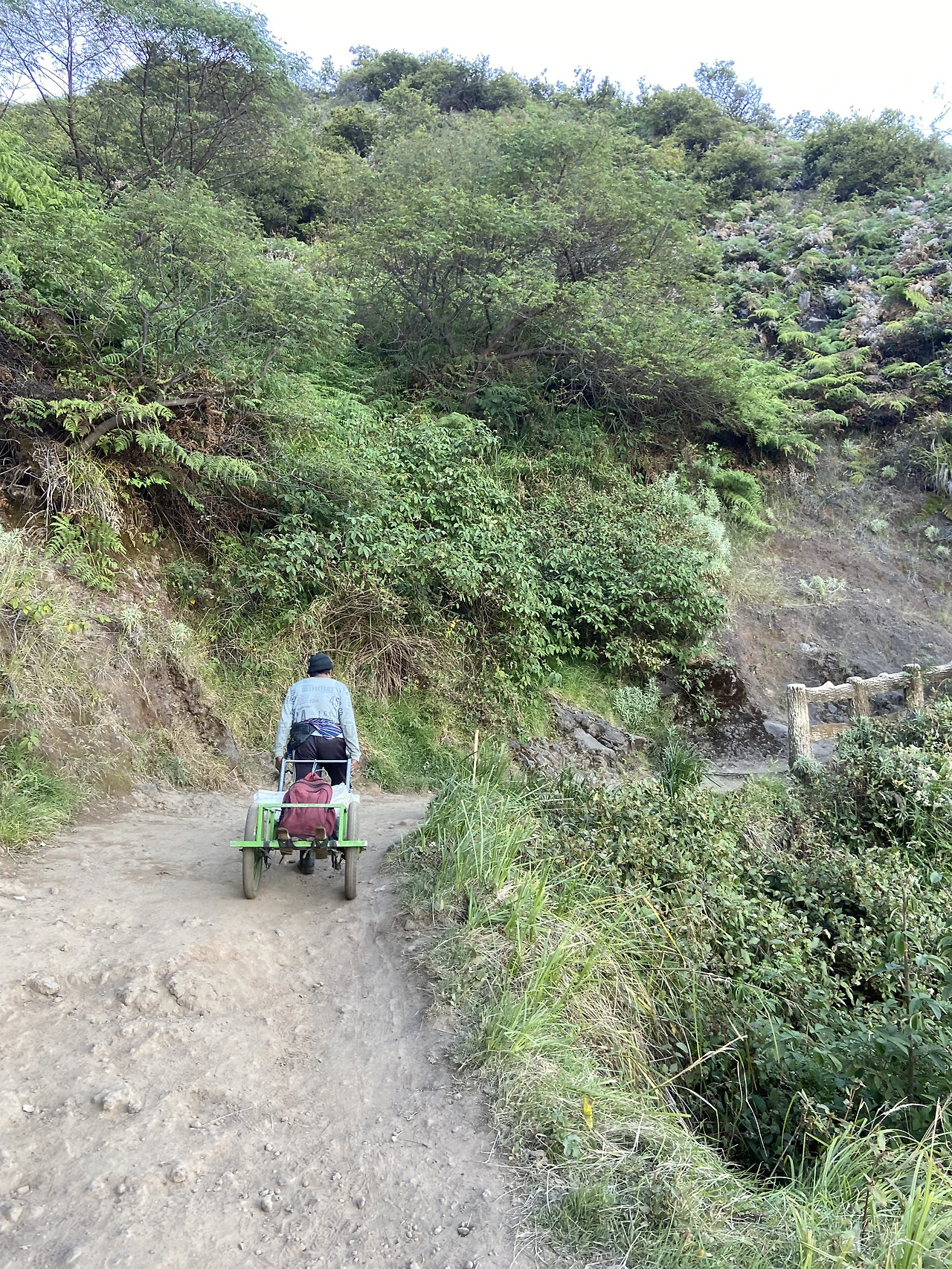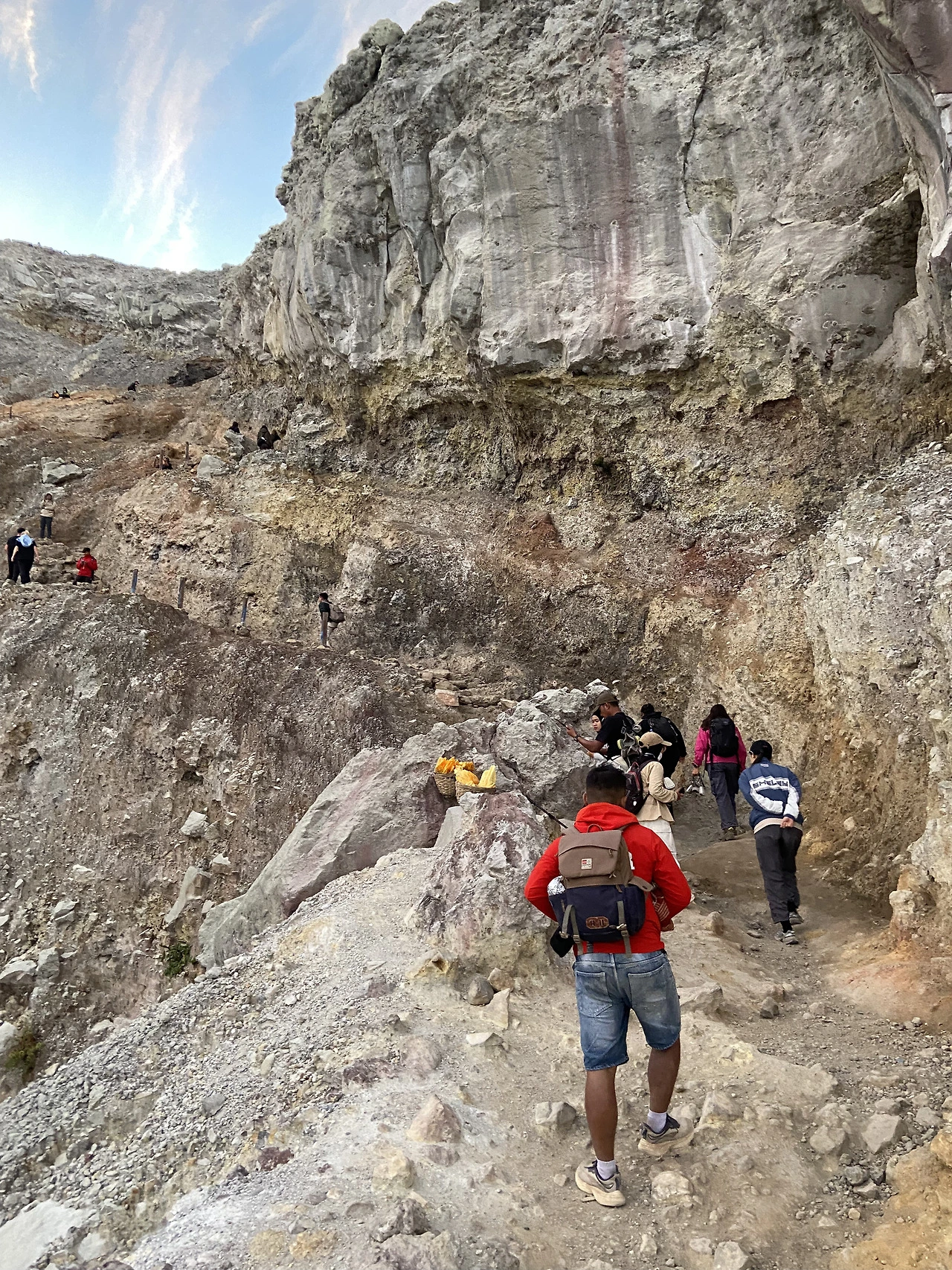 정상에 다시 오르니 5시가 넘었다. 잠시 앉았다가 다시 내려간다. 올라왔으니 내려가야죠… 평원 같은 정상을 걸어 나오면 내리막이 시작된다. 이제사 유황을 캐서 정리하는 아저씨도 보이고 람보르기니라 부르는 구루마도 보인다.