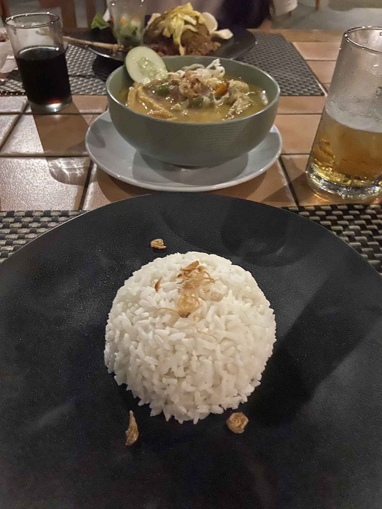 나시고랭이랑 이거 시켰는데 우리나라 삼계탕 같은 거다. 국물이 약간 코코넛 베이스 같은데 맛나다. 몸보신 제대로다. ㅋㅋ 맥주는 한 병만(비싸니께…)