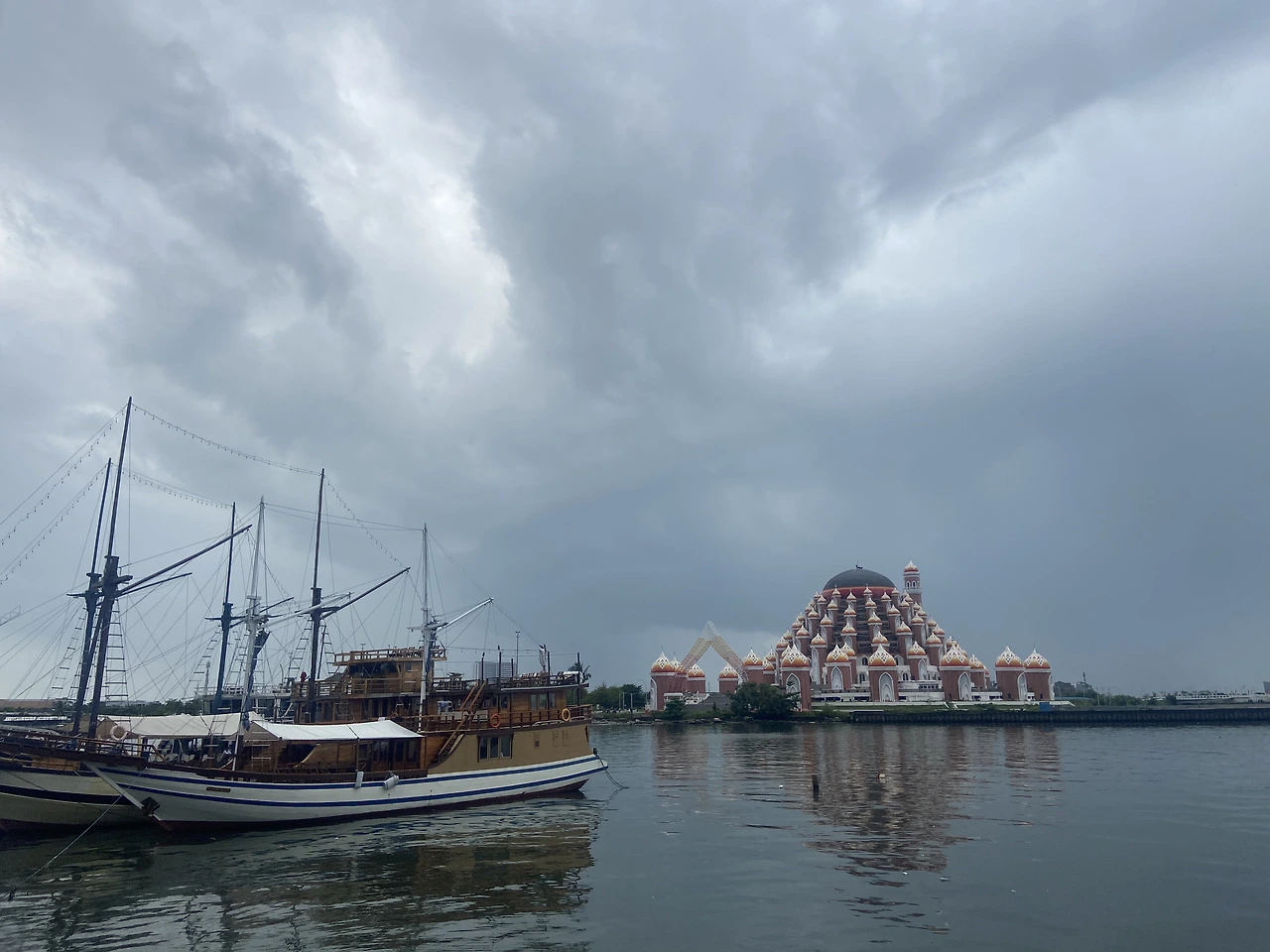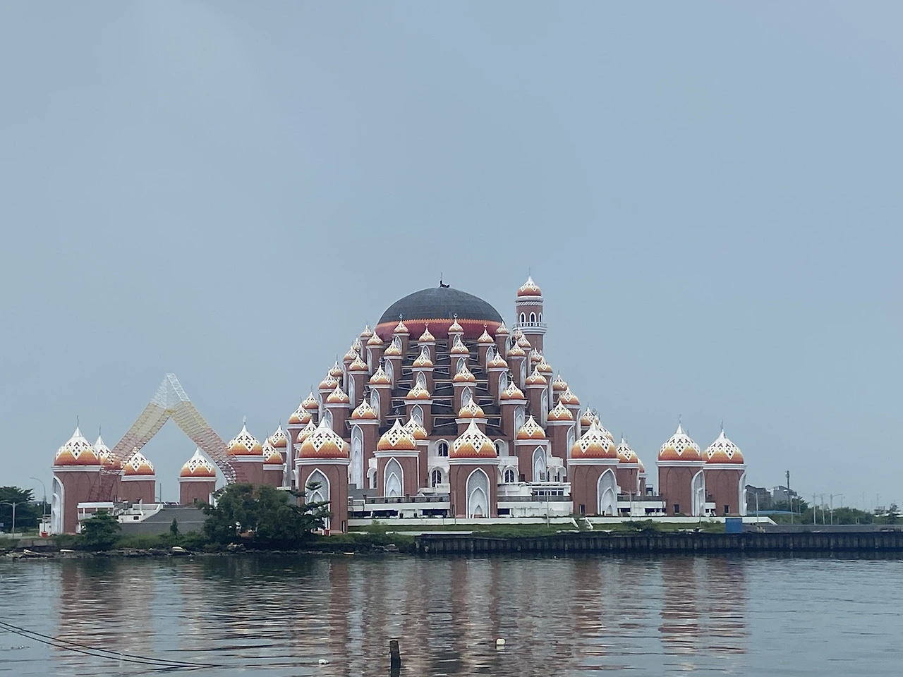 마카사르~ 이름도 낯선 이 도시… 관심도 정보도 없는 이 도시에서 3시간을 보낼 계획 따위는 없다. ㅋㅋ 검색해서 나오는 몇 군데 관광지 중 맘에 드는 하나만 가자.. 공항에서 시내까지 40-50분 걸린다. 오가는 시간 빼고 하나만 보고 밥 먹고 공항으로 돌아오기~그래서 간 곳은 바로 Masjid Asmaul Husna 99!! 99개 미나렛이 있는 이슬람 사원이다. 이슬람에서 신을 뜻하는 알라의 99가지 이름(아스마울 후스나)을 형상화해 99개의 돔/미나렛 디자인을 사용한 사원이다. 사원이 보이는 바닷가에서 사진을 찍었다. 생각보다 뭐.. 그냥…ㅎㅎ