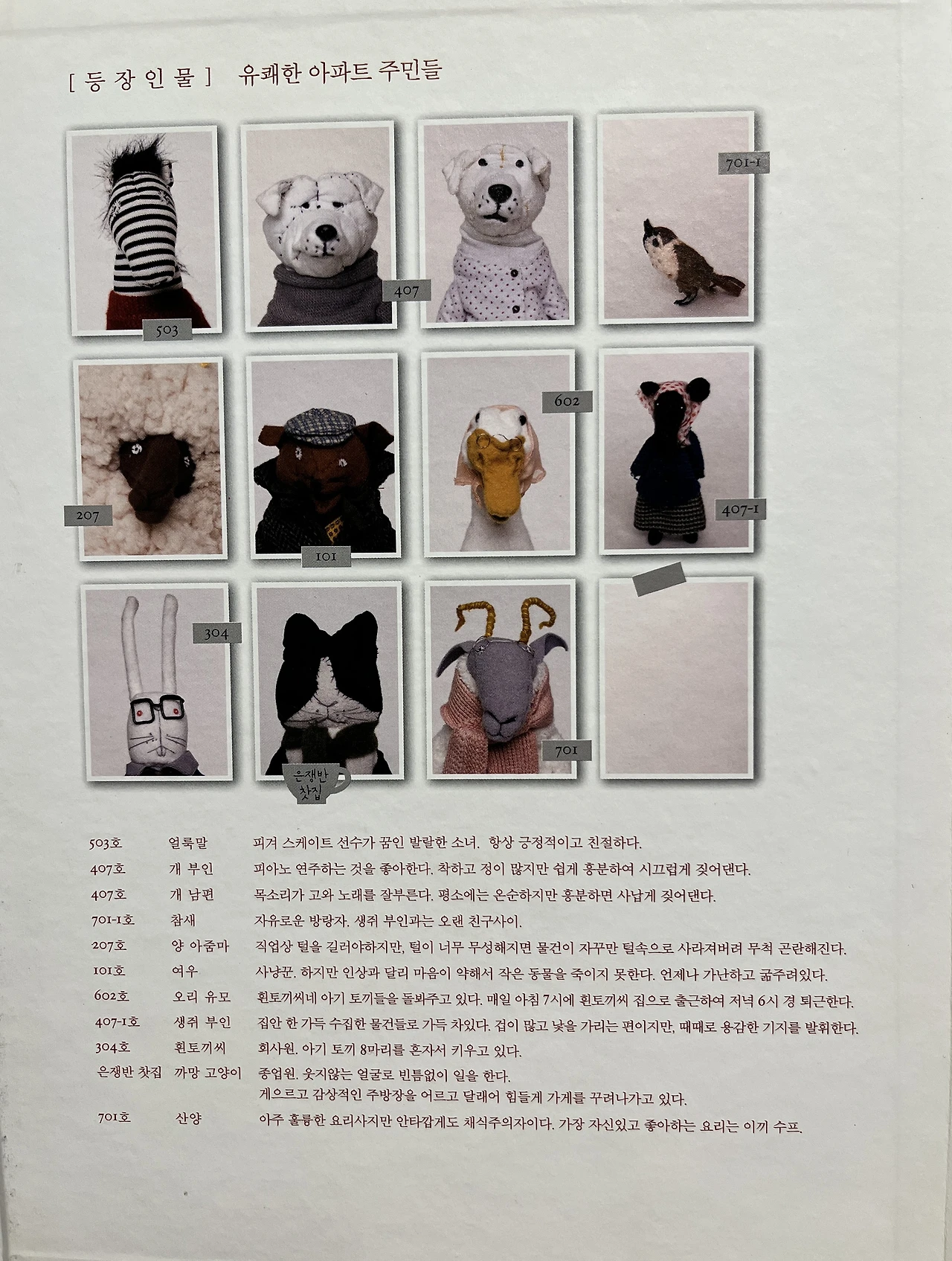 이런 심경을 확실하게 완성시켜 주는 것이 마지막 페이지에 등장하는 등장인물 표이다. ‘유쾌한 아파트 주민들’이라고 등장인형들에 대해 하나씩 짧은 역사와 배경을 기술해 놓았다.