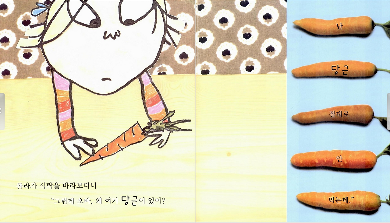 이런 재치 있는 번역을 읽어 나갈 때 문득 원문이 꽤나 궁금해졌다. 본 작품은 영국 작가 로렌 차일드의 작품이다. 분명 영어로 만들어진 어휘놀이에서 시작되었을 텐데, 번역이 제대로 이루어졌을까 하는 의문이 들었던 것이다. 결론적으로 깜짝 놀랄 만하게 성공적인 번역이었다. 원문의 뉘앙스와 내용을 해치지 않으면서도 한국어로 발음할 때 아이가 즐거울 만한 어휘를 제대로 가져다주었다고 생각한다. 어떤 것을 지칭하는가 상상이 되시는지.