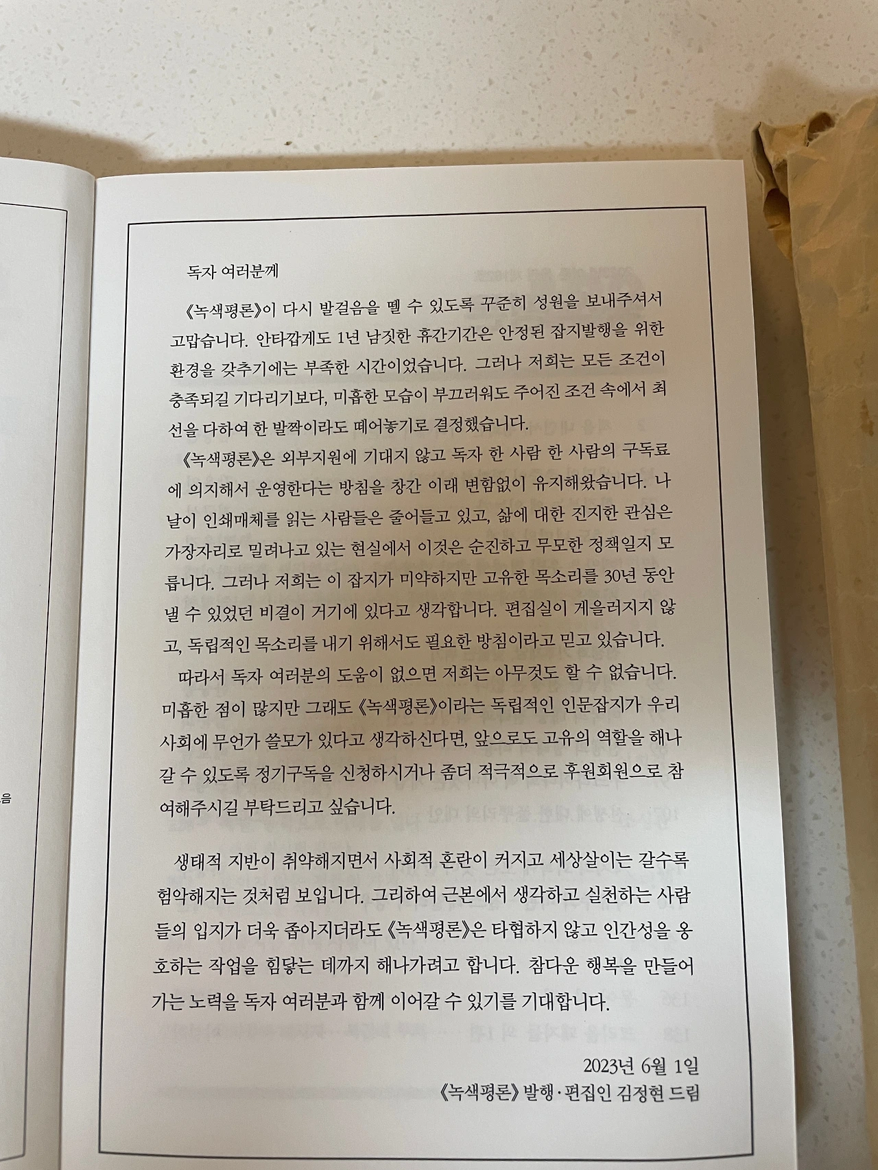 잡지를 읽든, 읽지 않든 나에게는 작은 기부 같은 일이었고 지난주 다시 시작한다는 반가운 편지를 읽고 정기구독을 시작했다.