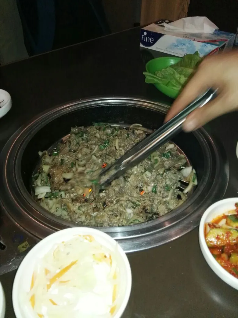 드디어 나온 불고기는 불판에 구워서 바로 먹는데 약간 달짝지근하고 짭조름한 맛이 이집트 친구들에게도 딱이었나 보다. 먼저 4인분을 시켜서 먹었는데 금방 다 먹어서 1인분 추가에 닭불고기도 1인분 추가해서 더 먹었다.
