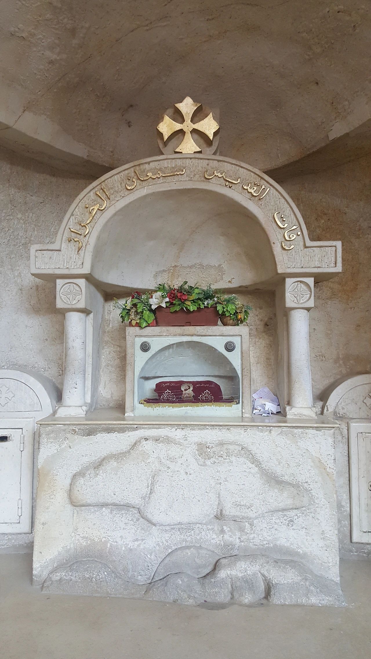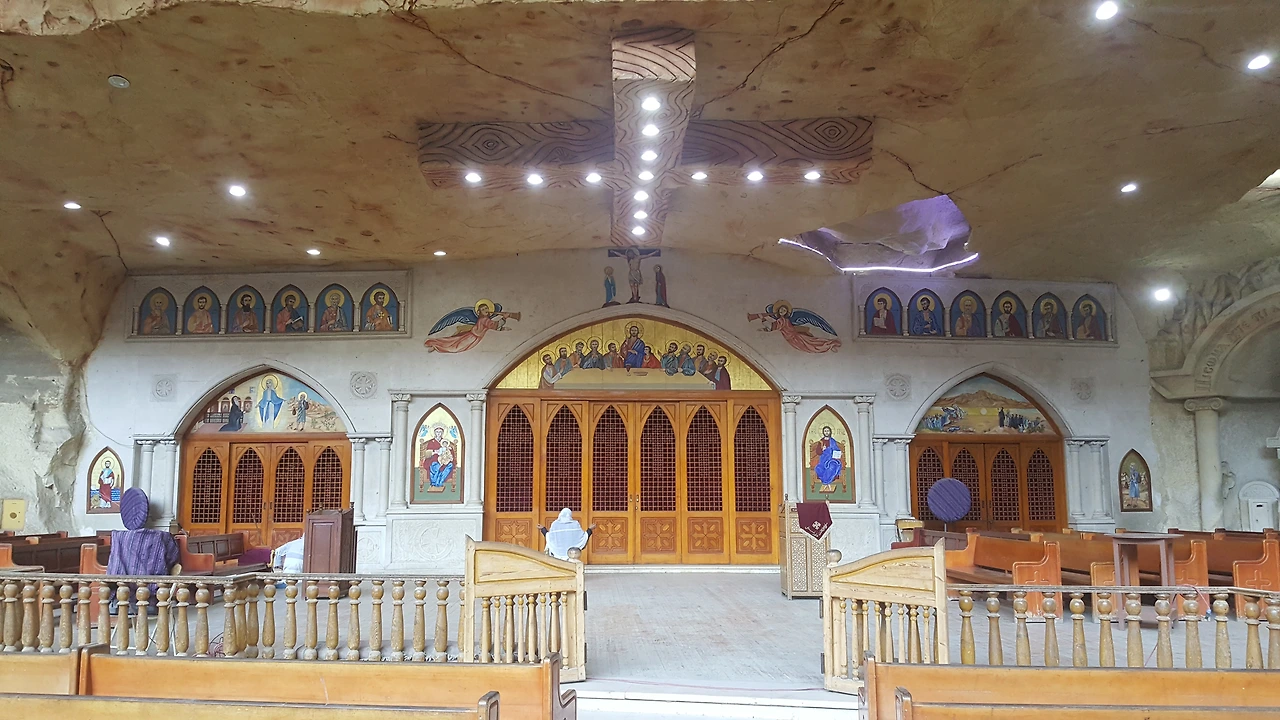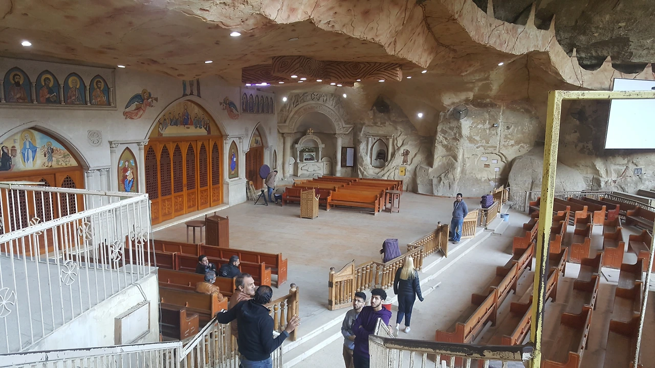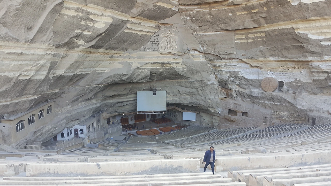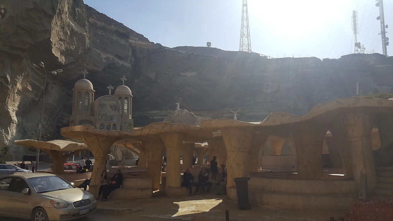 이 동굴 교회는 하얀 돌산 파인 곳에 예배 장소를 만든 15,000명 수용 가능한 중동 지역 최대 교회라고 한다. 이 교회의 정식 명칭은 모카탐 시몬 교회. 1969년 정부 정책에 따라 모카탐으로 이주하게 된 카이로 곳곳의 쓰레기 마을 사람들은 자신의 신앙을 위한 공동체를 이 동굴 깊은 곳에 세우게 되었다. 동굴과 언덕에 세우게 된 교회들은 1989년 성인으로 추앙받은 ‘시몬’을 통해 기적이 일어난 1000주년을 기념해 지금의 동굴 교회를 세우고 그 이름을 세인트 시몬 교회라고 짓게 되었다고 한다. 그래서 예배 강단에는 성인으로 추앙받은 ‘시몬’을 기리는 물건들과 그림들이 있었다.