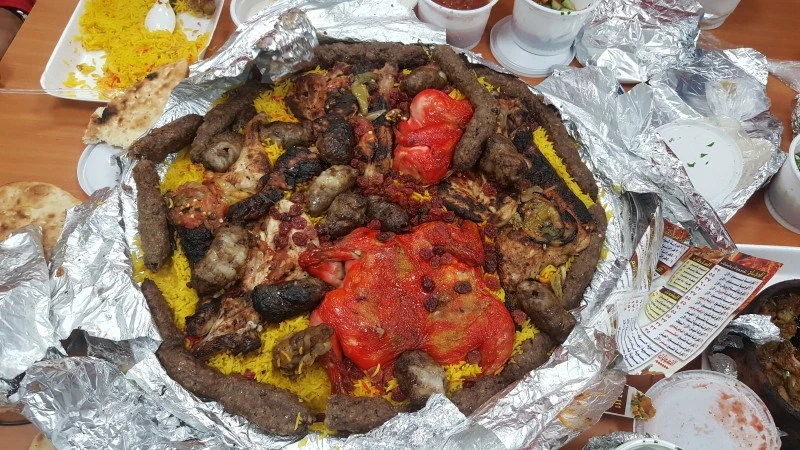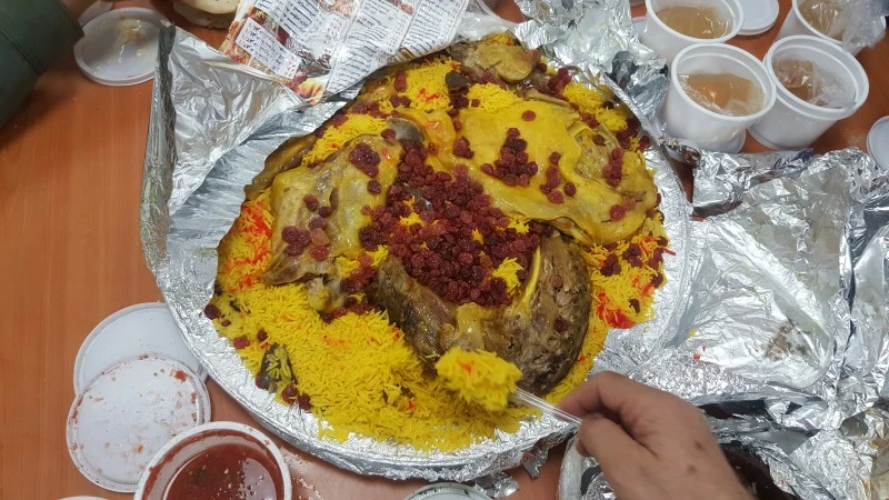 이집트도 손으로 음식을 먹는 문화가 일반적이다. 그리고 한가득 음식을 담은 큰 접시를 여러 사람이 나눠 먹는 종류의 음식이 많다. 이번에 먹은 음식은 아래 볶음밥이 있고, 그 위에 소고기, 양고기, 닭고기가 올려져 있는 음식이었다. 또한 볶음밥에 건포도나 건과류도 같이 섞여 있는데 난 건포도를 별로 좋아하지 않기 때문에 그것만 빼고 먹었다. 노란 볶음밥에 빨간 닭고기, 갈색의 소고기, 노란색 양고기까지, 정말 먹음직스러운 모습이었다.