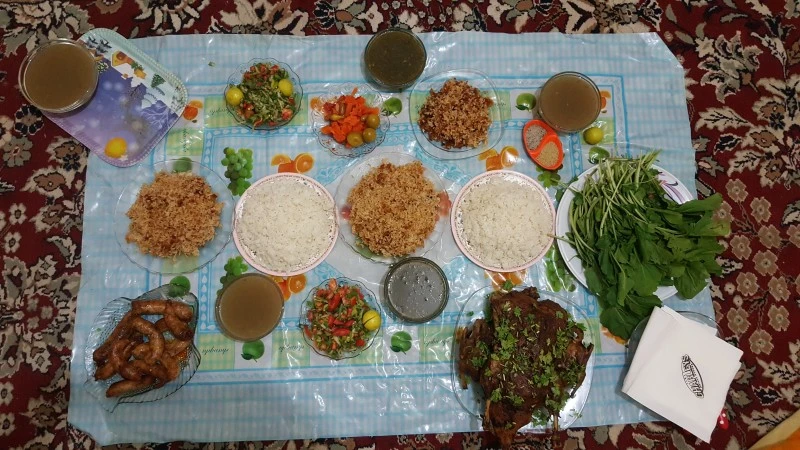 이렇게 집 구경과 주변 구경을 하고 있을 동안에 맛있는 음식이 준비되어 있었다. 정말 그리웠던 그 음식. 음식을 보자마자 군침이 돌았다. 바닥에 식탁보를 깔고 그 위에 하나하나씩 음식이 오는데 내 입술이 절로 올라갔다.