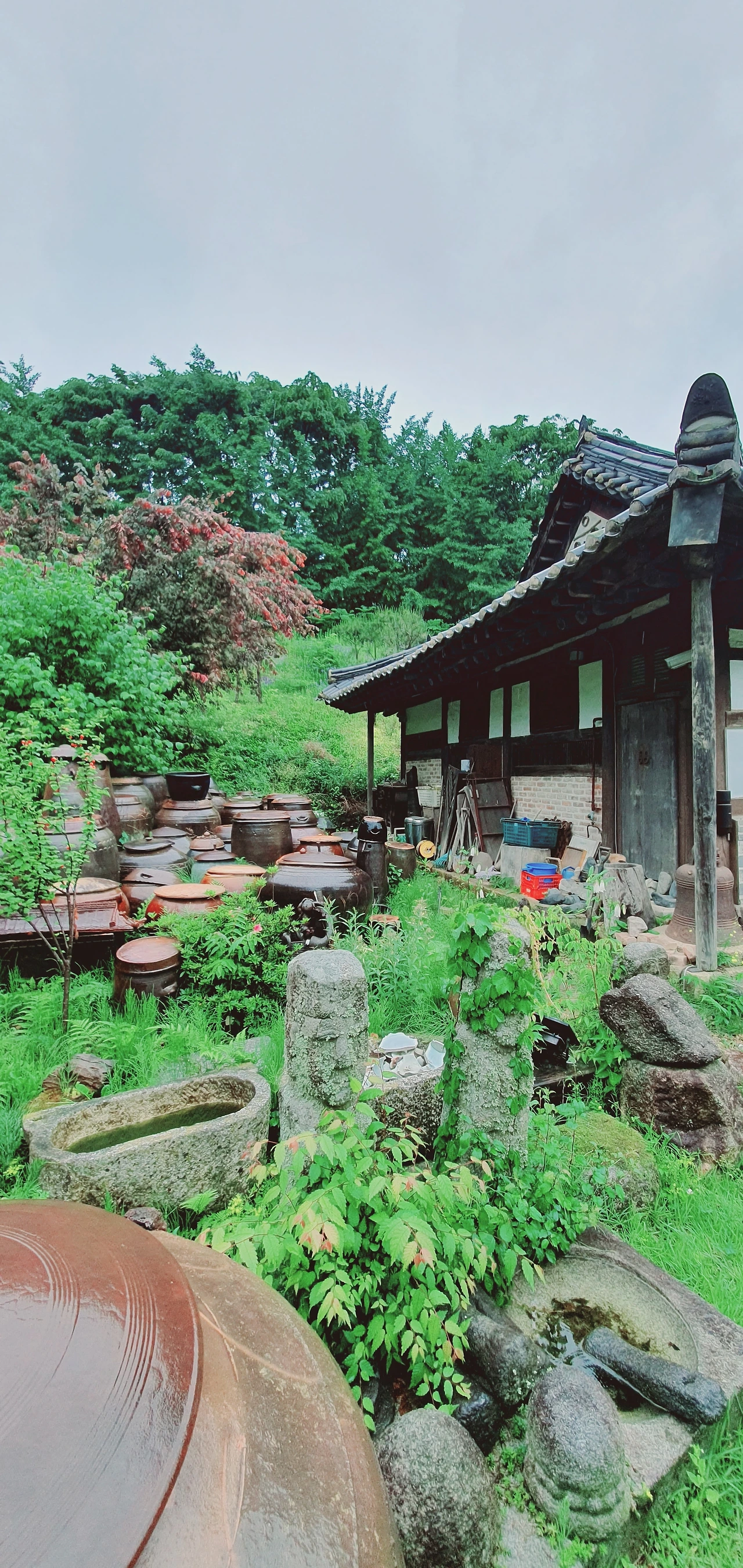 친구 가족들이 도착하고 서로 인사를 하고 짐 정리 후에 숙소 바로 앞에 있는 찻집으로 갔어. 친구네 가족들과 함께 간식 먹으며 이야기를 하려고. 원래는 다같이 계곡으로 갔어야 했는데 비가 많이 와서 갈 수가 없었어. 전통 찻집에서 다같이 맛있는 차를 마시고 찻집 구경도 했어. 특히 시아랑 민서는 개구리랑 올챙이 보는 재미에 푹 빠졌고, 현준이는 한자 공부에 열심히였어. '어떻게 노는 것보다 한자를 더 좋아할까' 신기했지만 한번 빠지면 질릴 때까지 한다고.