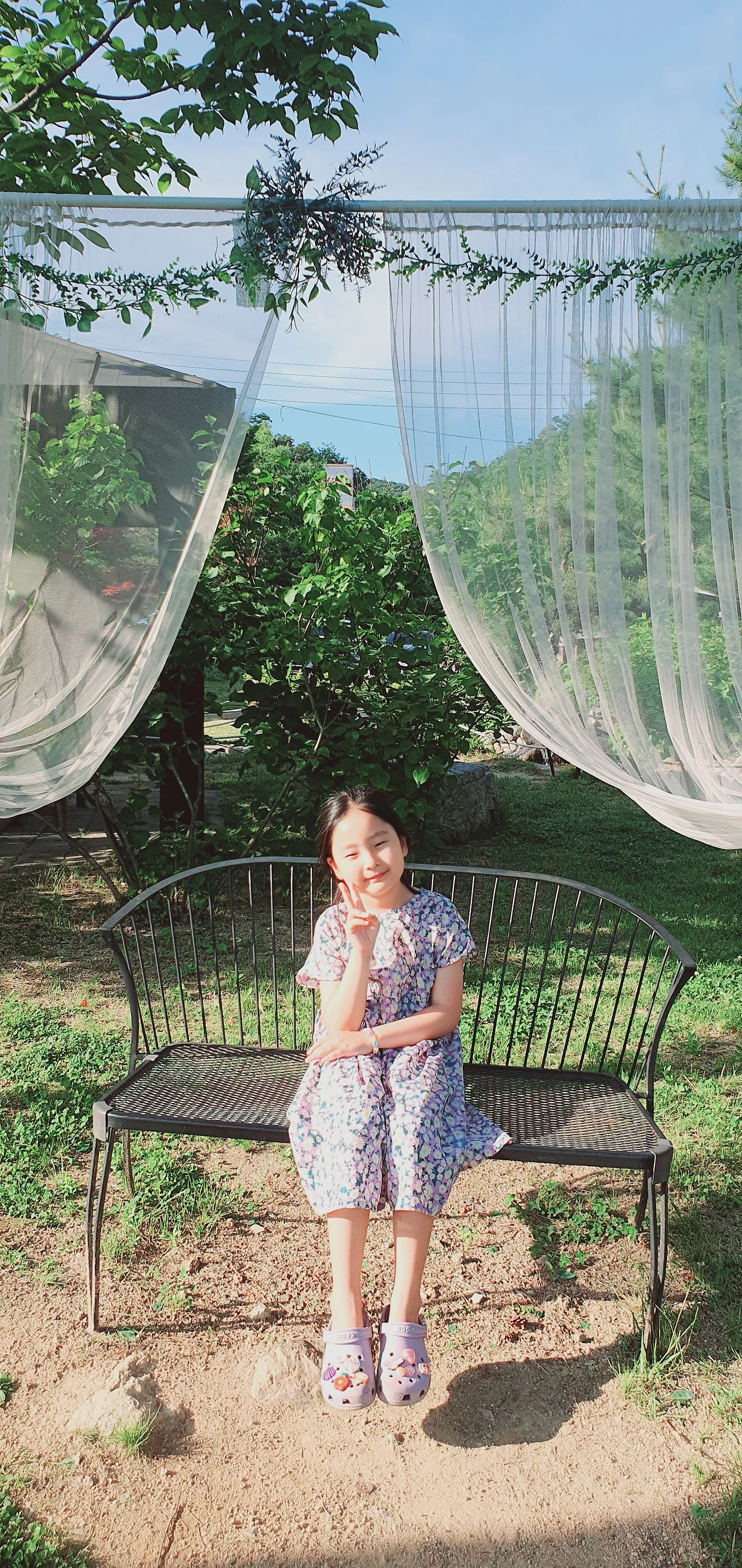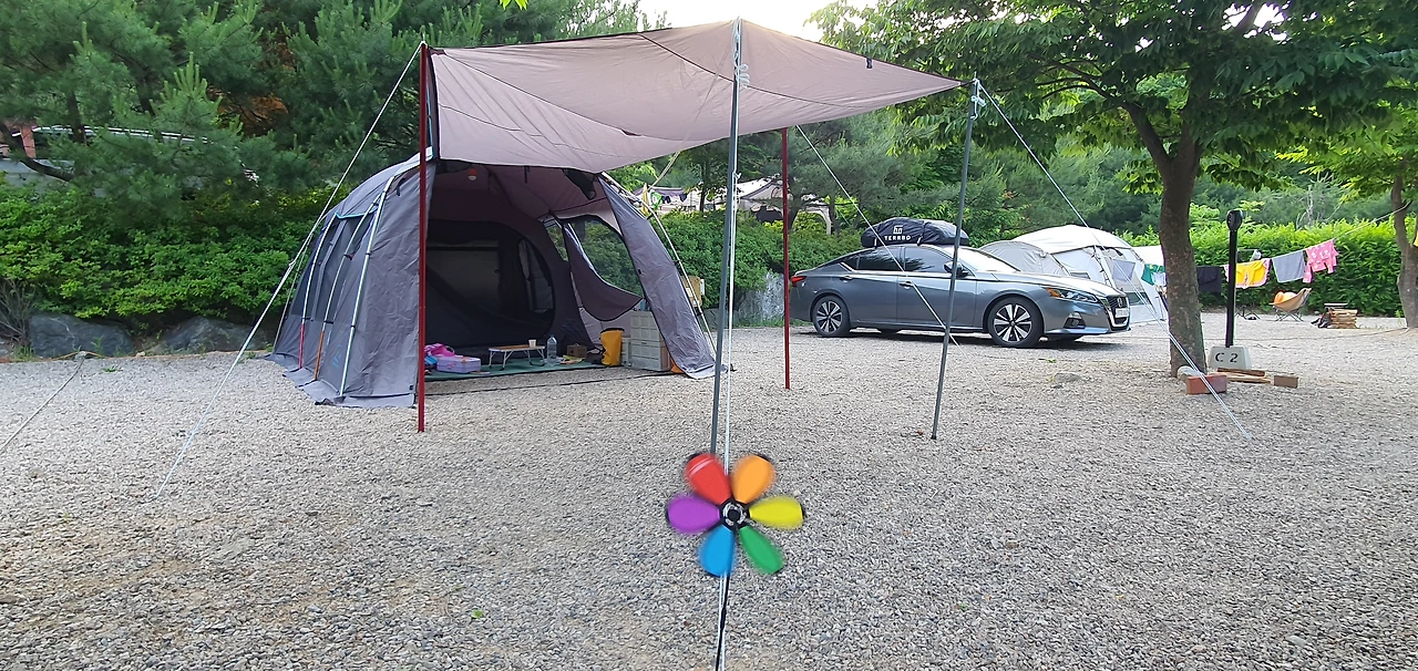 햇살 한가득 머금고 도착한 캠핑장은 밖에서는 전혀 안 보이는 산속에 있었어. 인기가 많은 캠핑장이라고 했는데 첫인상부터 기분이 좋았어. 맑은 공기도 실컷 마실 수 있고, 주변에 도로가 없어 조용하고, 다양한 새소리도 들을 수 있었어. 특히 뻐꾹뻐꾹 뻐꾸기 소리가 가장 기억에 남네. 새벽에 자야 하는데 조금은 시끄러웠지만 또 언제 이런 새소리를 들어보겠어. 시아에겐 아주 좋은 경험이라고 생각해.