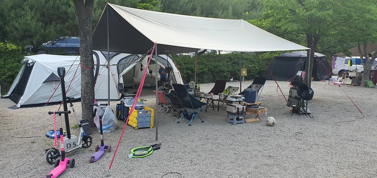 다빈이네 가족들과 캠핑 사이트는 떨어져 있었지만 문제 되지는 않았어. 어차피 타프 친 곳에서 거의 있을 거니까. 그리고 캠핑사이트가 넓어서 두 식구 지내기에 전혀 문제가 되지 않았어. 옆 주차장이 되어버린 사이트가 눈에 밟혔지만 비워달라고 할 수도 없고 너무 안타까웠지.