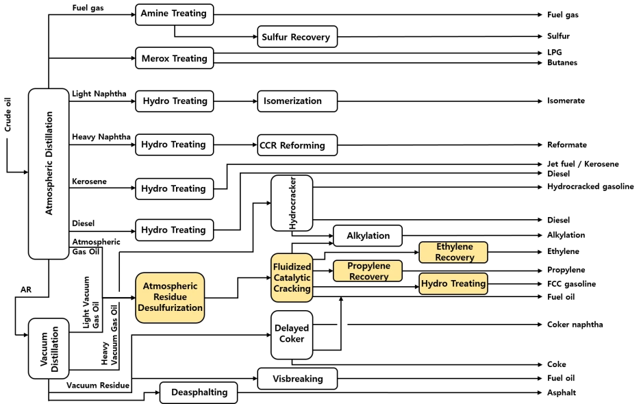 내가 맡은 프로젝트는 태국에 건설하는 Refinery (정유) 공장으로 ARDS, FCC, ERU, PRU, SRU, ARU, SWS 등 다양한 공정으로 구성되어 있었다(아래 노란색 부분). 그중 중요한 공정으로는 Atmospheric Residue Desulfurization (ARDS) 중질유탈황시설로서 *AR 중에 포함된 황과 금속 성분을 수소 첨가 반응으로 제거하는 공정, Fluidized Catalytic Cracking (FCC) 유동접촉분해시설로 ARDS를 거쳐 정제된 AR을 고온, 고압의 촉매와 함께 반응기에 넣어 AR 분자를 작은 분자로 분해해 가솔린 등을 만들어내는 공정 등이 있었다. 그리고 이 프로젝트는 우리 회사 단독으로 수행하는 것이 아니라 다른 회사와 같이 진행하는 Joint Venture (JV)로 두 회사의 협력이 중요한 프로젝트였다.