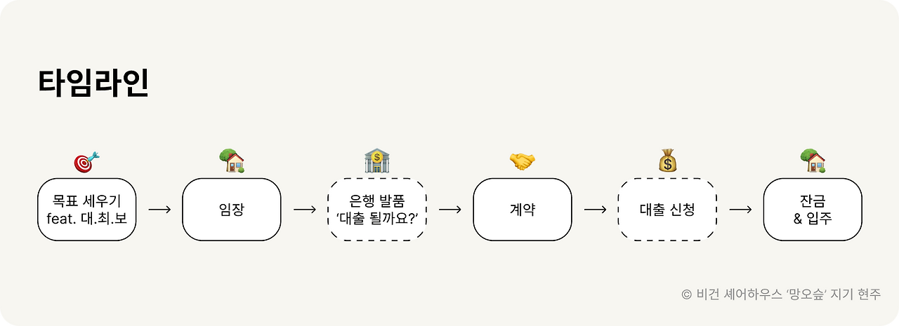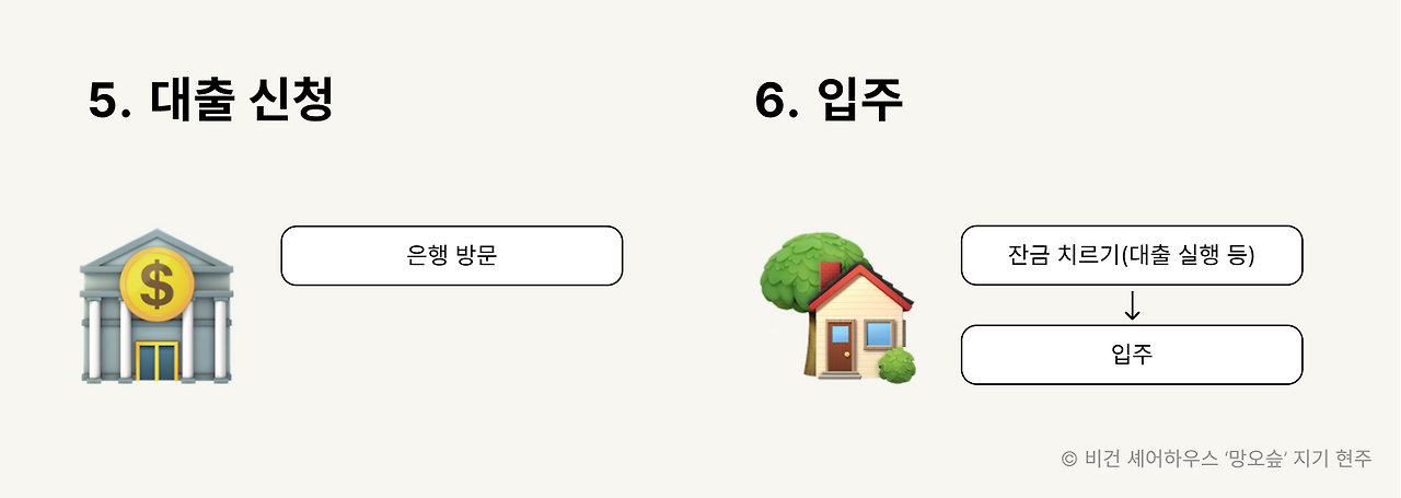 어떤 집을 구할 건지 목표를 세우고 → 집을 보러 다니다가 마음에 드는 집이 나타나면 → 이 집이 대출이 나오는지를 확인하고 → 계약을 한 뒤 → 은행에서 대출을 신청하고 → 입주일에 잔금을 치르며 이사를 합니다.