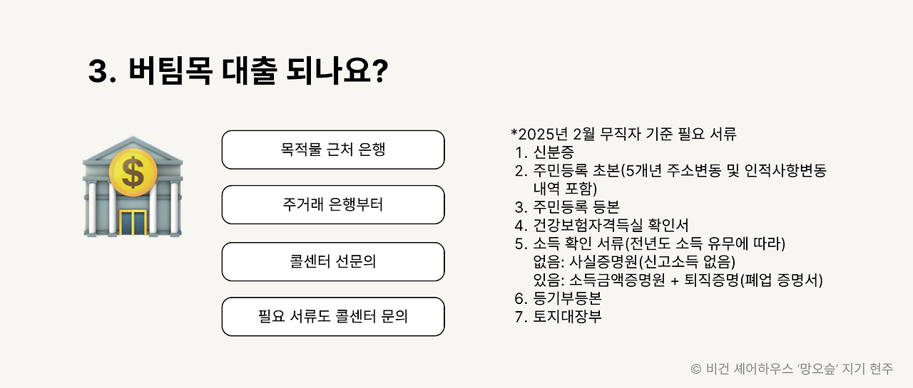 기억해야 할 건, 목적물 근처 은행에 가야 한다는 거예요. 만약 계약할 집이 망원동이면 망원동부터 돌아보세요. 서교동에 있는 은행 갔더니 현장실사 나가기 어렵다고 반려당했어요.