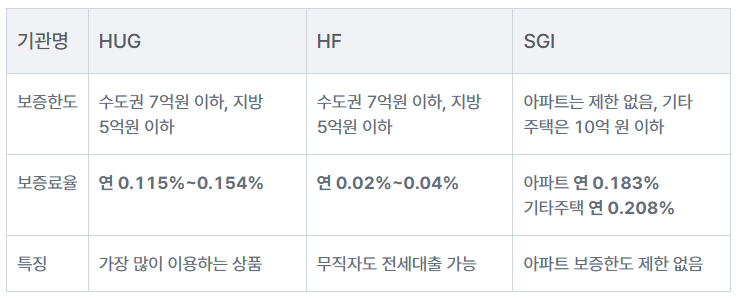 - HF: 보증료가 가장 저렴해요! 하지만 HF에서 제공하는 전세자금대출을 이용할 때만 가입할 수 있어요.