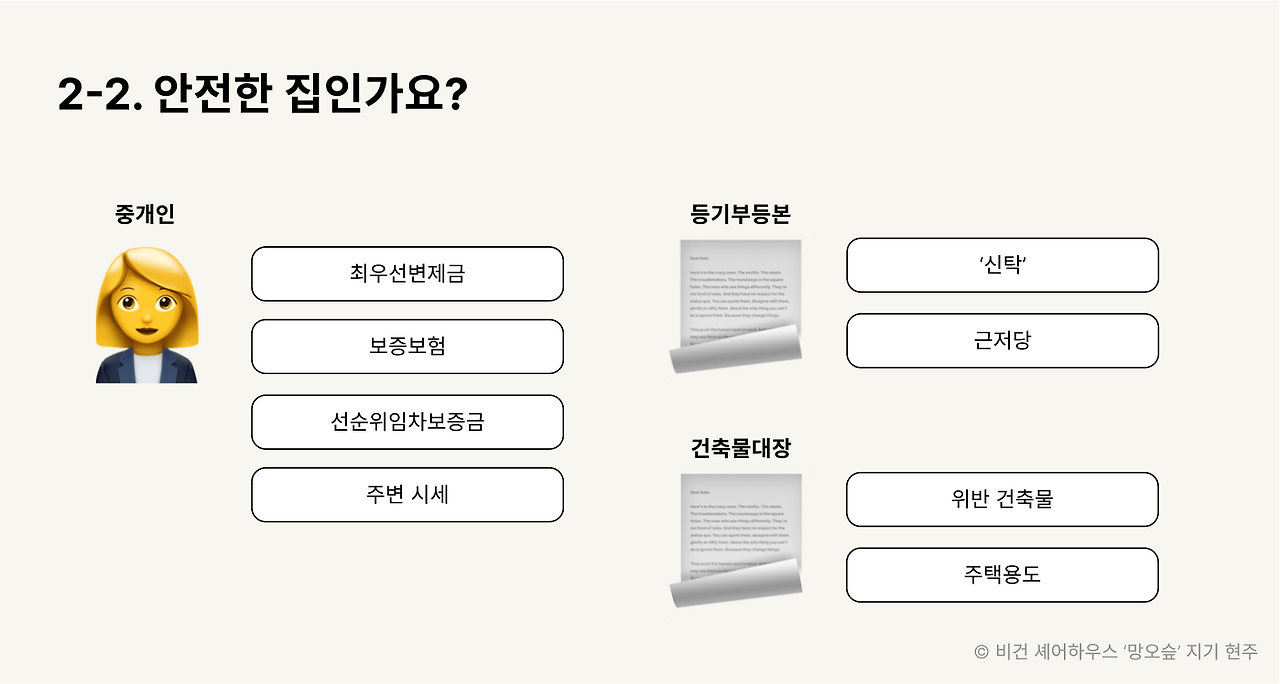 중개인은 나와 집을 중개해 주는 사람일 뿐이에요. 믿을만한 중개인조차도 기본적인 것만 신경 써주죠. 집에 하자가 없는지, 계약서상 문제가 없는지 정도요. 대출이나 보증보험은 정확하게 모르는 분들도 정말 많고요.