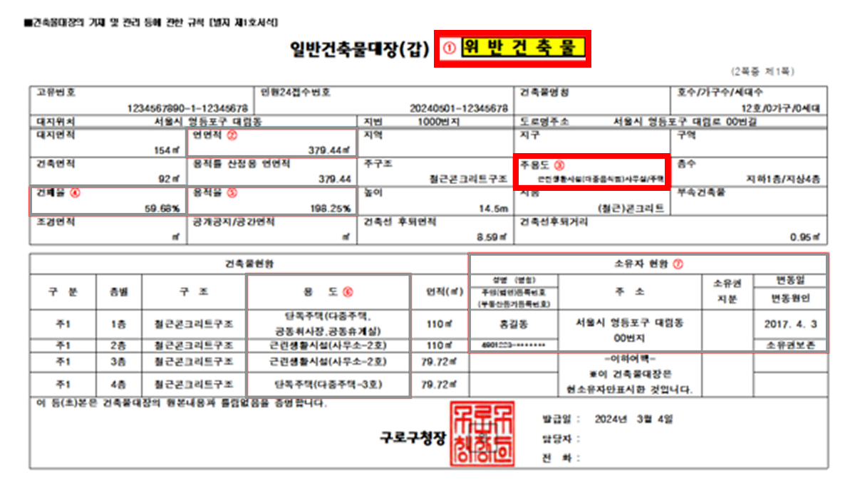 건축물대장 타이틀 우측에 떡하니 박혀있어요. 만약 위반건축물이 아니라면, 마크가 없으니 안심해도 됩니다.