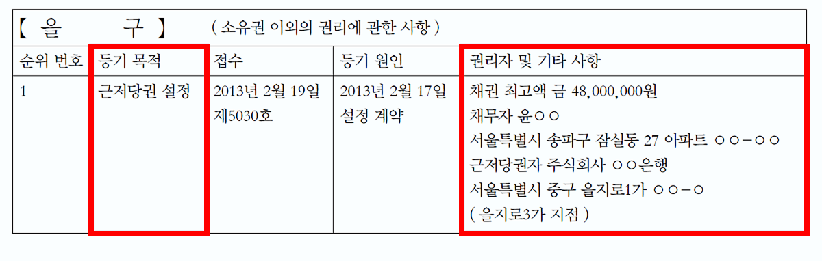 근저당은 쉽게 말해 집주인이 집을 담보로 대출을 받았다는 의미예요. 만약 집이 경매로 넘어갈 때, 채권 최고액이 설정되어 있으면 내가 돌려받을 돈이 없거나 적어질 수 있어요. 사진에는 4,800만 원이 저당 잡혀있죠? 내 보증금보다 이 4,800만 원이 우선된다는 말이에요.