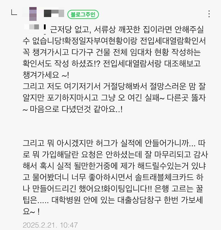 17개 지점을 확인했는데요, 전부 다가구여서 안된다고 했습니다. 싹쓸이 거절당했어요. 한 군데서 거절할 때마다 망치로 머리를 한 대씩 후두려맞는 느낌이었는데요. 17대를 맞은 저는 지구의 내핵까지 뚫고 푸욱 꺼졌어요. 활기차게 시작해야 할 하루의 시작부터 거절만 내리 당하니 멘탈이 아팠습니다. 대체 사람들은 어떻게 대출을 받은 거지? 답답한 심정에 저처럼 무소득&다가구 집으로 대출받은 블로그 후기에 댓글을 달았습니다. 그랬더니 한 분이 정말 친절하게 답글을 달아주셨어요.