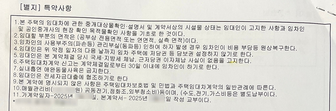 계약서에서는 특약이 젤 중요한데. 중개인은 '이런 건 한 번도 써본 적 없다, 집주인이 기분 나빠할 거다' 하며 특약으로 안 써준 게 많아요. 그래서 대부분은 구두로 협상했어요. 좀 더 강하게 얘기해볼걸 싶기도 해요.