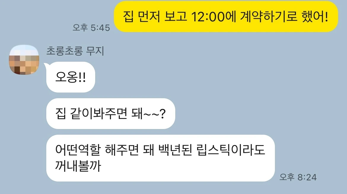 는 사실 친구에게 동행을 부탁한 거예요. 집 구하러 다닐 때 은행, 부동산, 공공기관 여기저기서 이상한 일이 많았거든요. 어린 여자애라고 만만하게 보는듯한 눈빛, 말투, 태도, 불쾌한 경험. 최근에 이사한 친구도 이에 격하게 공감하며 시간을 내주었습니다.